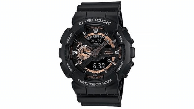 Модель Casio GA110RG-1A G-Shock не разочарует мужчин, которые ищут прочные часы. Как следует из названия, эти ударопрочные спортивные часы оснащены прочным черным полимерным ремешком.