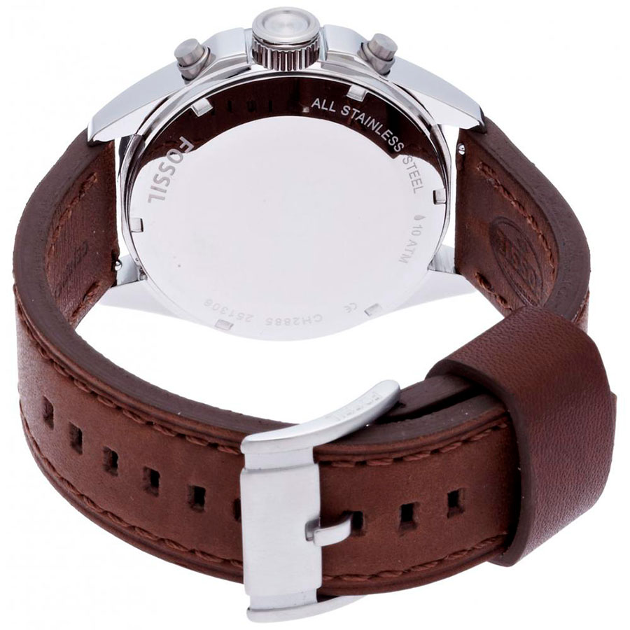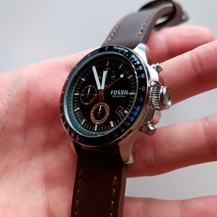 Мужские кварцевые наручные часы с хронографом (секундомером) Fossil CH2885 коллекции Decker. На циферблате отображается дата и время суток (24-х часовая шкала). На безеле присутсвует шкала тахиметра для измерения средней скорости движения. Секундомер может отсчитывать до 60 минут. На корпус частично нанесено стойкое PVD покрытие. Кожаный ремешок. Водонепроницаемость WR100 (10 атм).