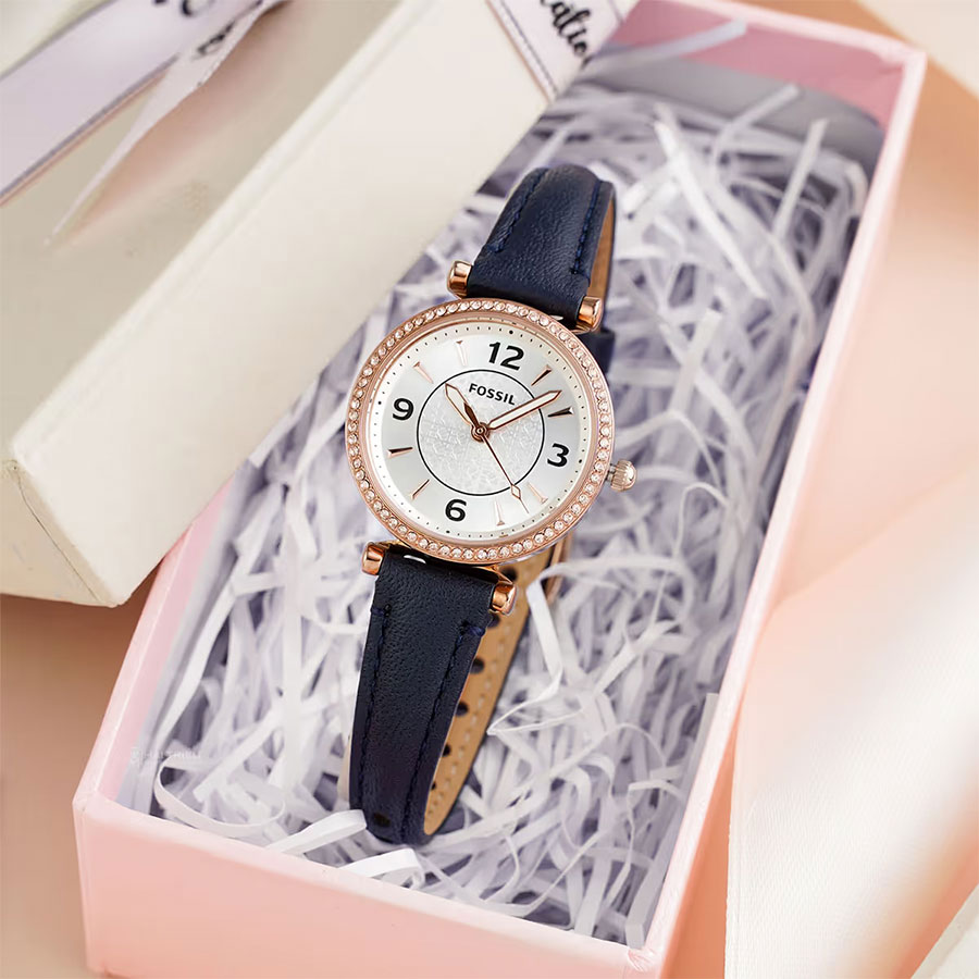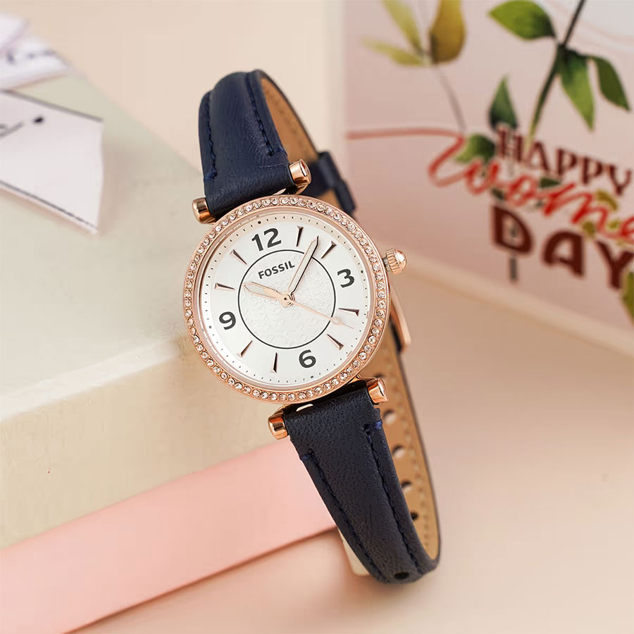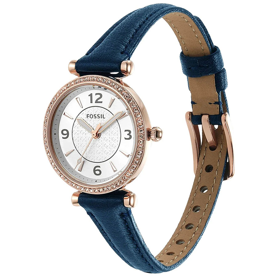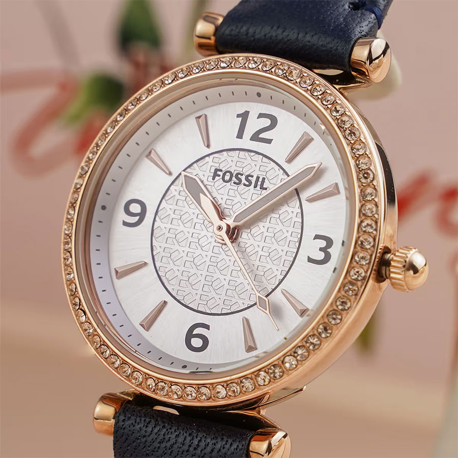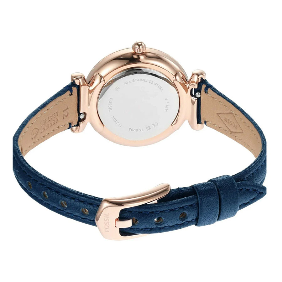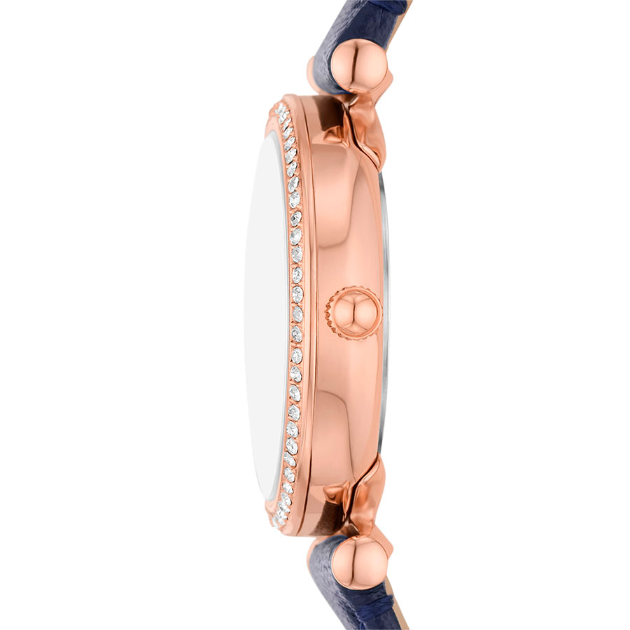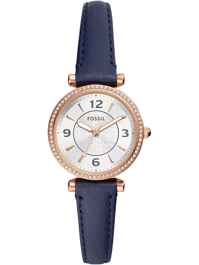Женские кварцевые наручные часы Fossil ES5295 коллекции Carlie. На корпус часов нанесено стойкое PVD покрытие. Кожаный ремешок. Корпус украшен кристаллами. Водонепроницаемость WR50 (5 атм).
