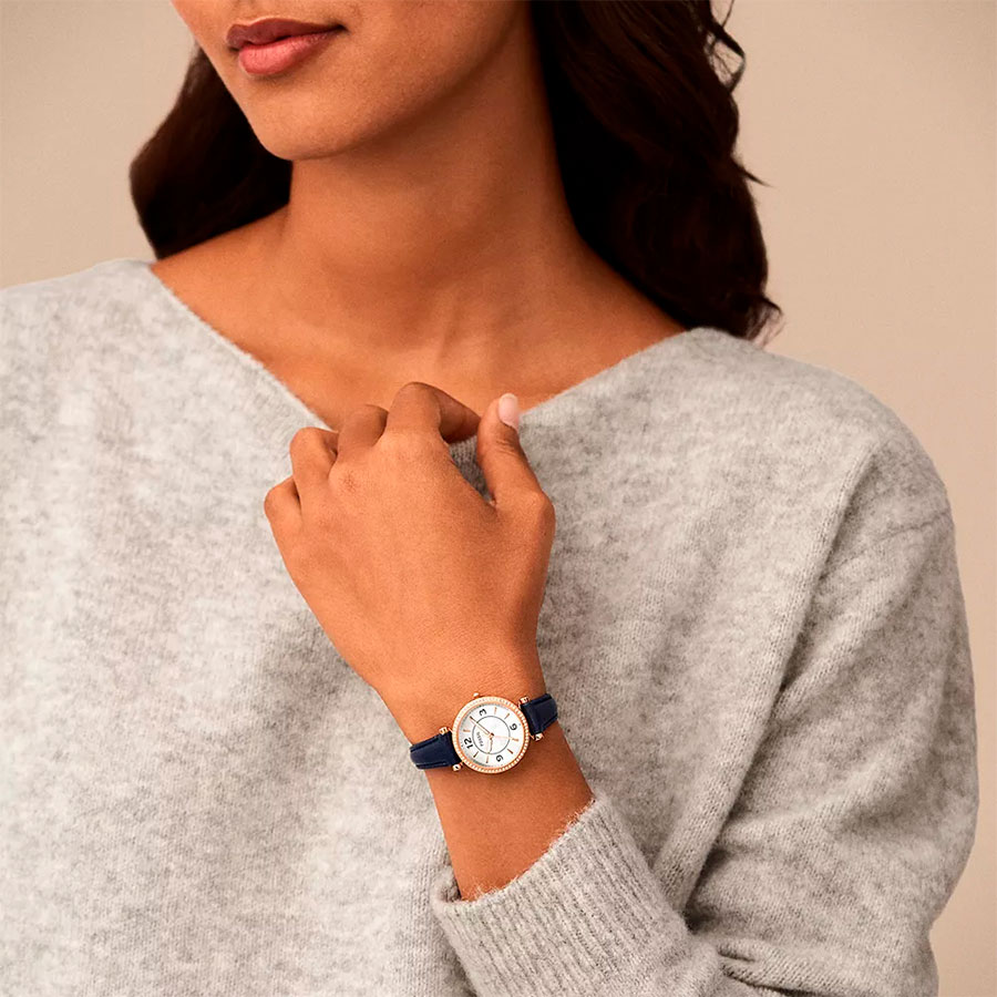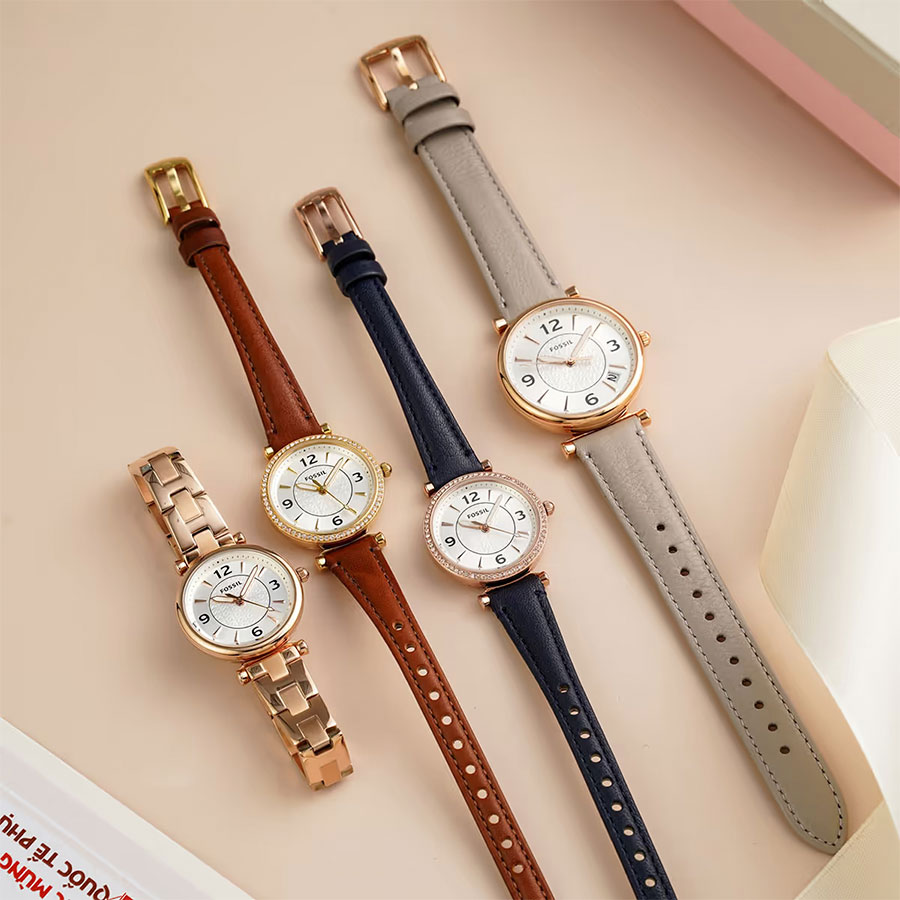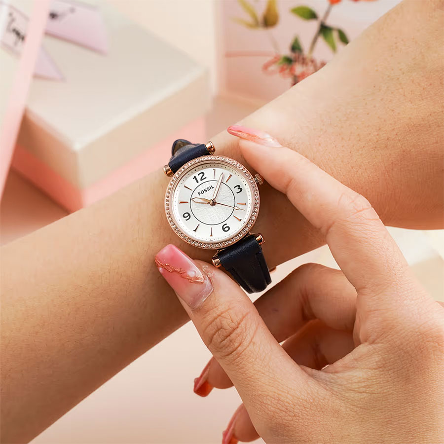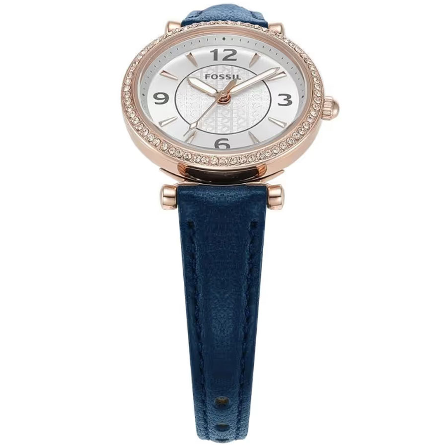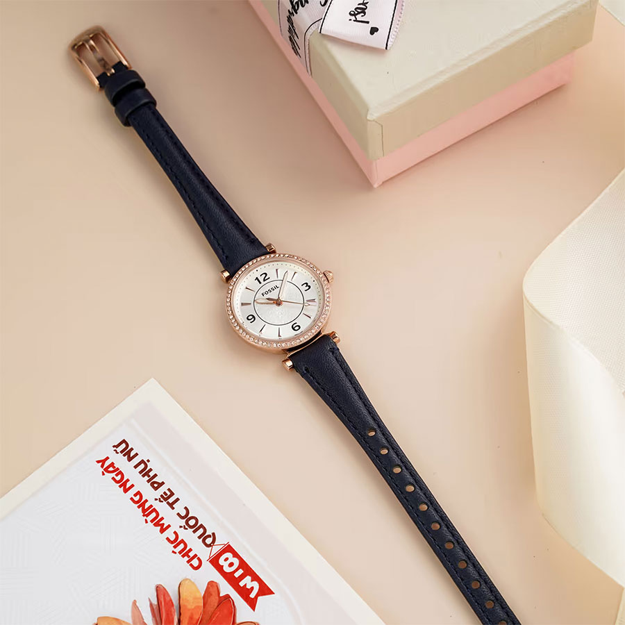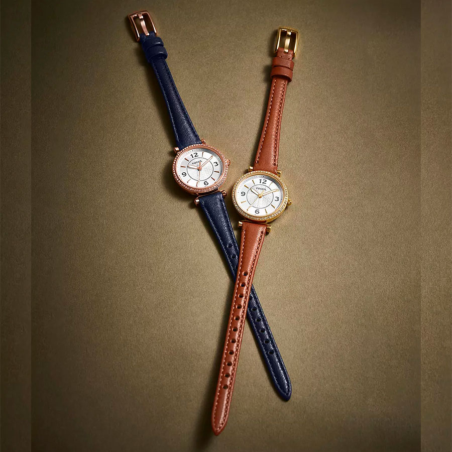 Женские кварцевые наручные часы Fossil ES5295 коллекции Carlie. На корпус часов нанесено стойкое PVD покрытие. Кожаный ремешок. Корпус украшен кристаллами. Водонепроницаемость WR50 (5 атм).