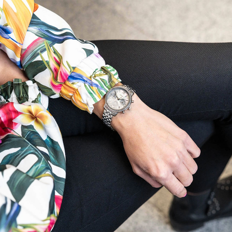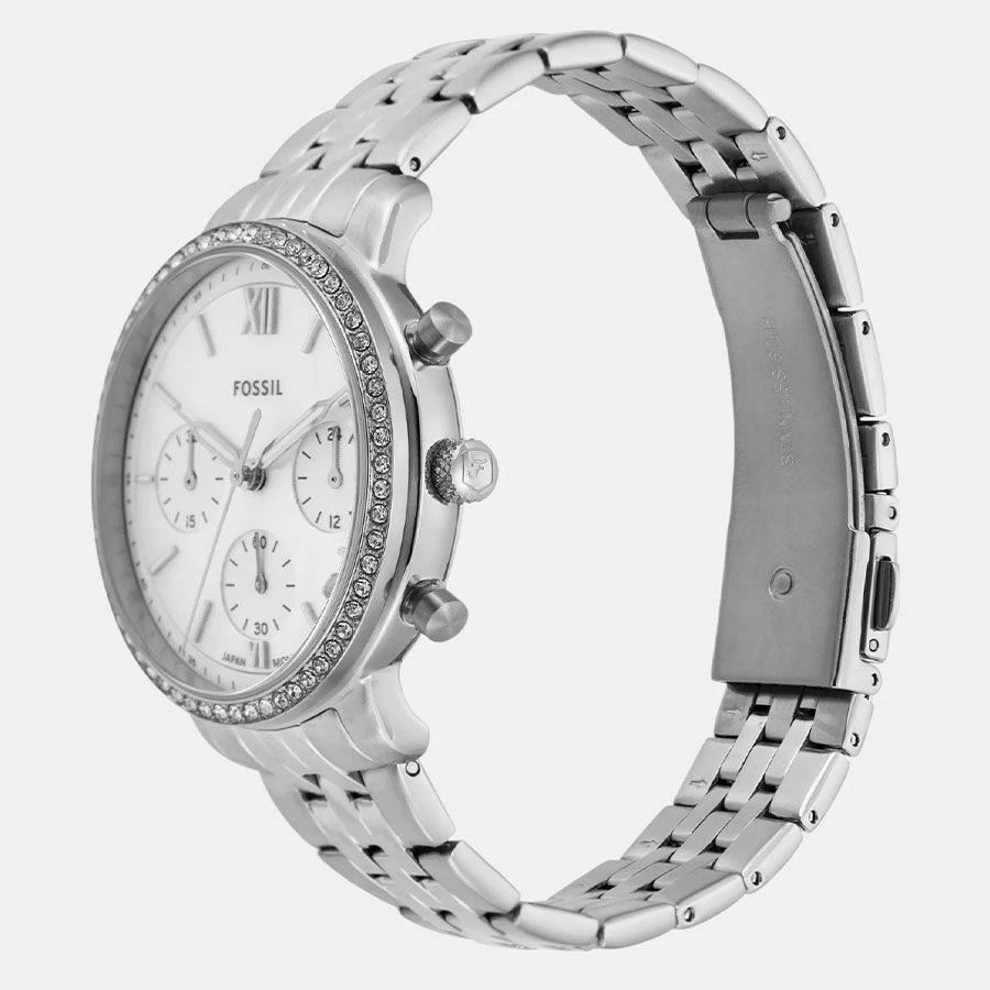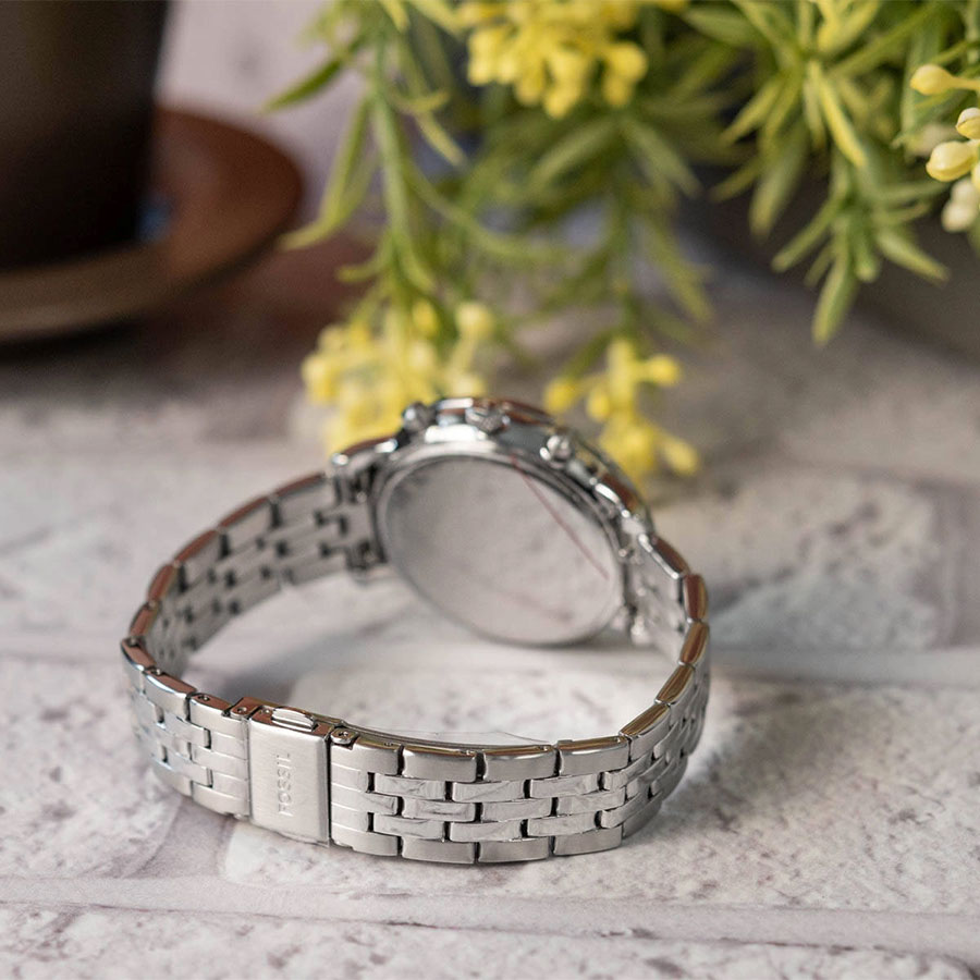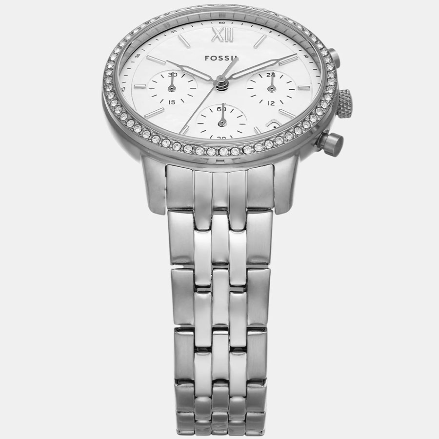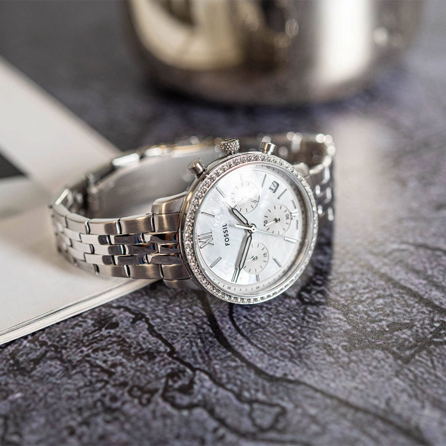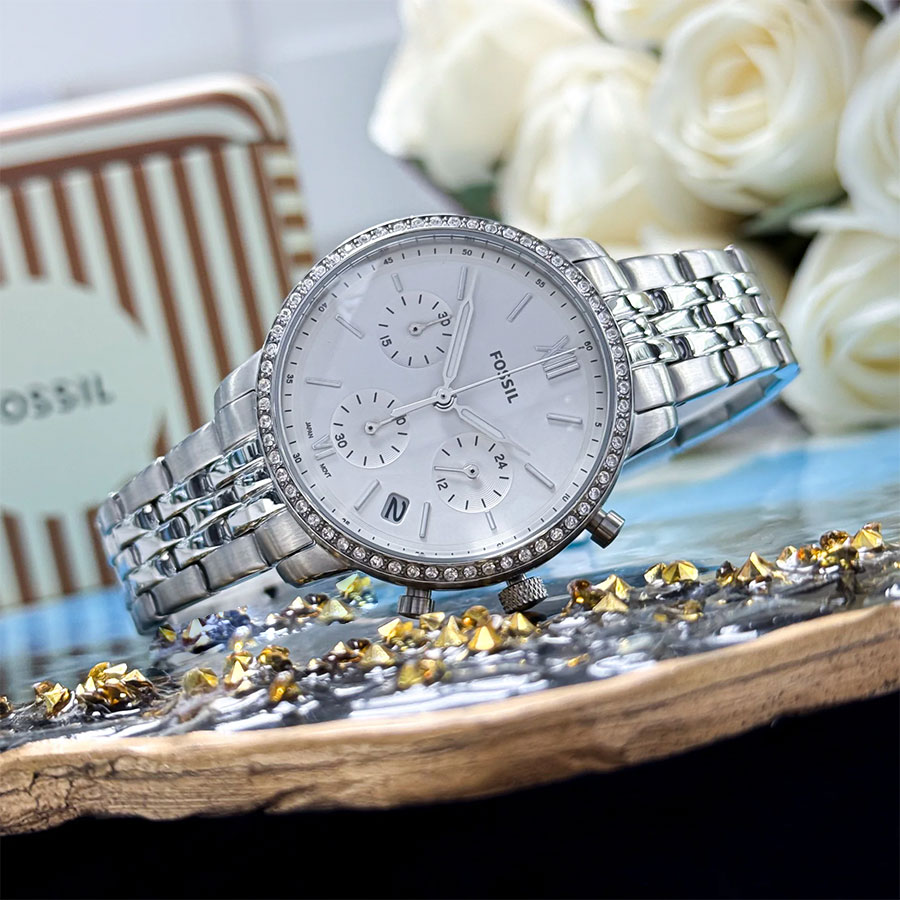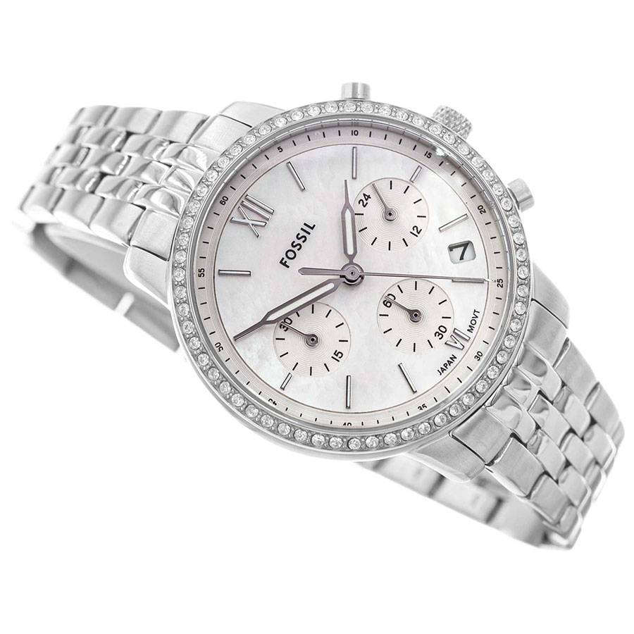 Женские кварцевые наручные часы с хронографом (секундомером) Fossil ES5357 коллекции Neutra Chronograph. Секундомер может отсчитывать до 30 минут. На данной модели отображается дата и время суток (24-х часовая шкала). Стальной браслет. Корпус украшен кристаллами. Водонепроницаемость WR50 (5 атм).