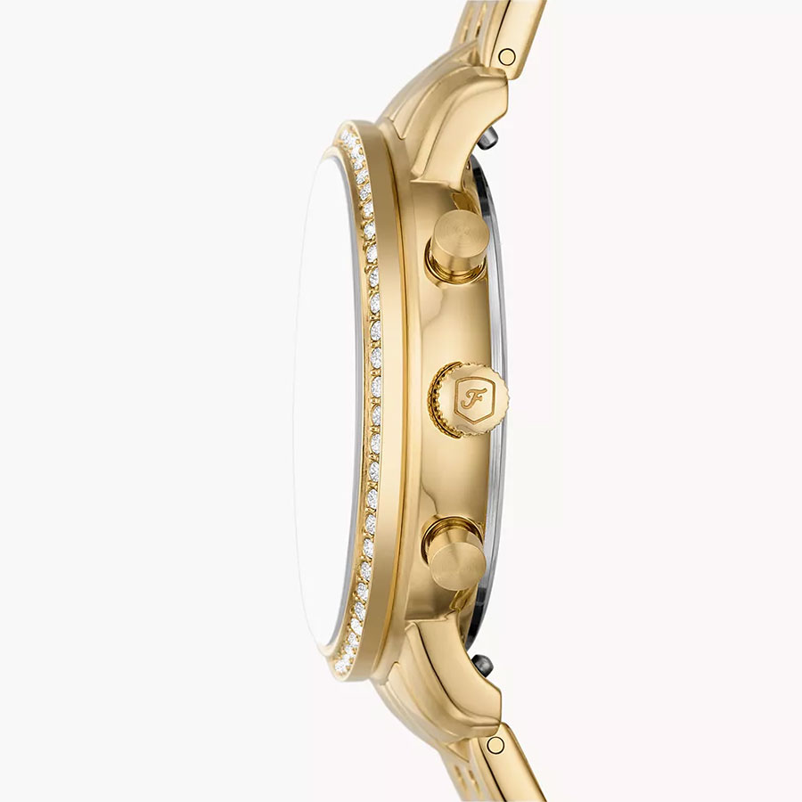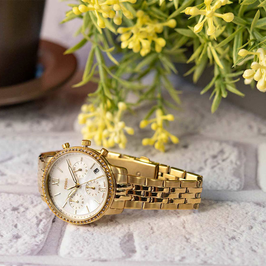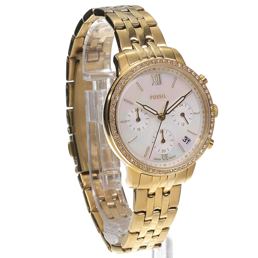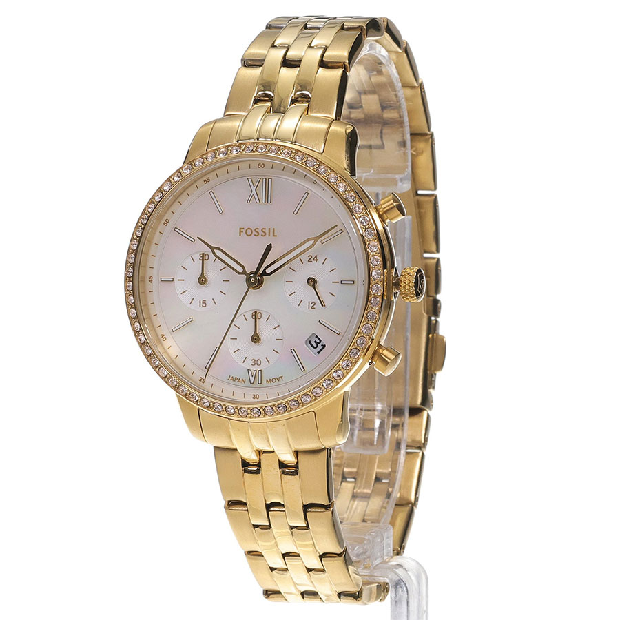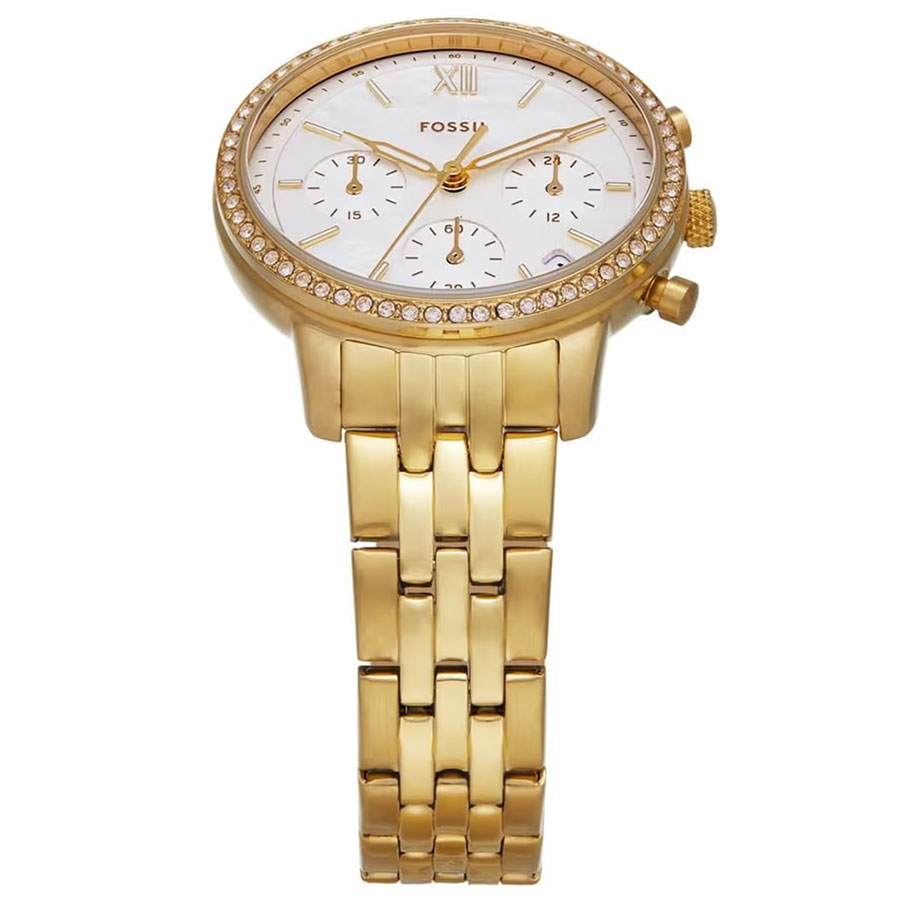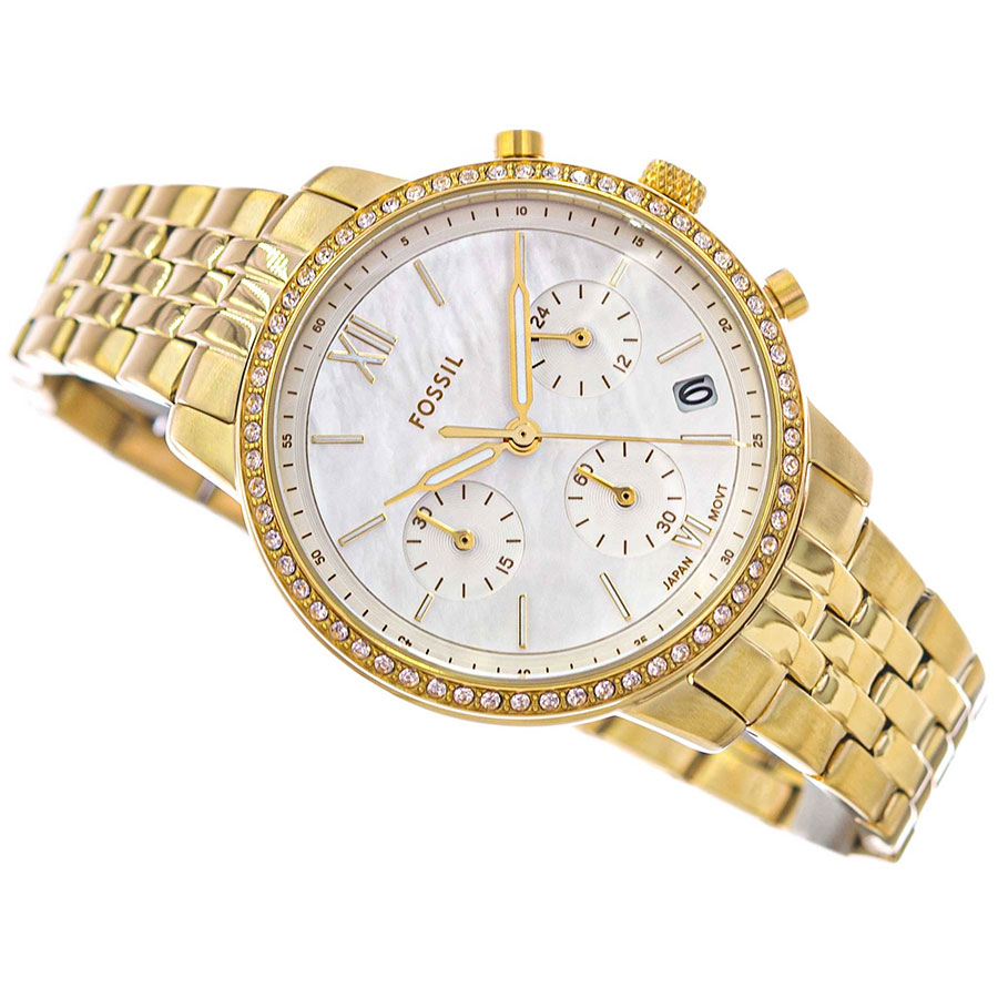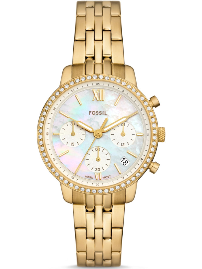 Женские кварцевые наручные часы с хронографом (секундомером) Fossil ES5358 коллекции Neutra Chronograph. Секундомер может отсчитывать до 30 минут. На данной модели отображается дата и время суток (24-х часовая шкала). Стальной браслет. На корпус и браслет нанесено стойкое PVD покрытие. Корпус украшен кристаллами. Водонепроницаемость WR50 (5 атм).