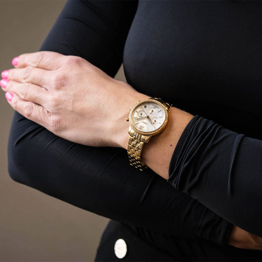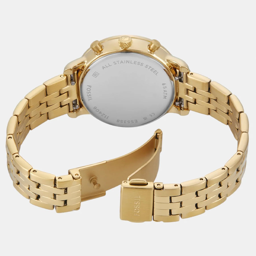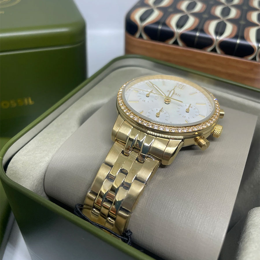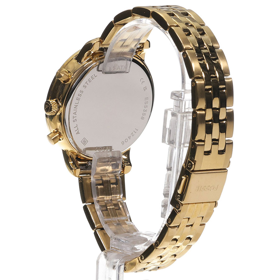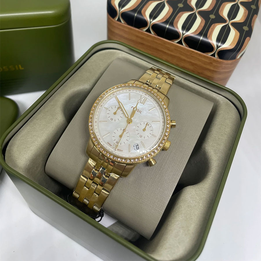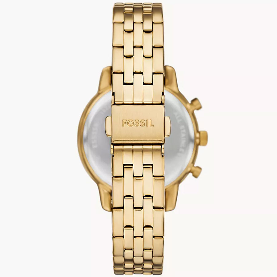 Женские кварцевые наручные часы с хронографом (секундомером) Fossil ES5358 коллекции Neutra Chronograph. Секундомер может отсчитывать до 30 минут. На данной модели отображается дата и время суток (24-х часовая шкала). Стальной браслет. На корпус и браслет нанесено стойкое PVD покрытие. Корпус украшен кристаллами. Водонепроницаемость WR50 (5 атм).
