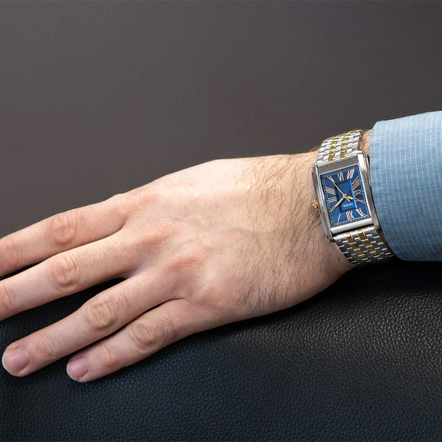 Корпус выполнен из нержавеющей стали, а браслет дополнен стойким PVD покрытием на отдельных звеньях, что придаёт часам выразительный акцент и защищает поверхность от износа. Стекло надёжно оберегает циферблат от царапин.