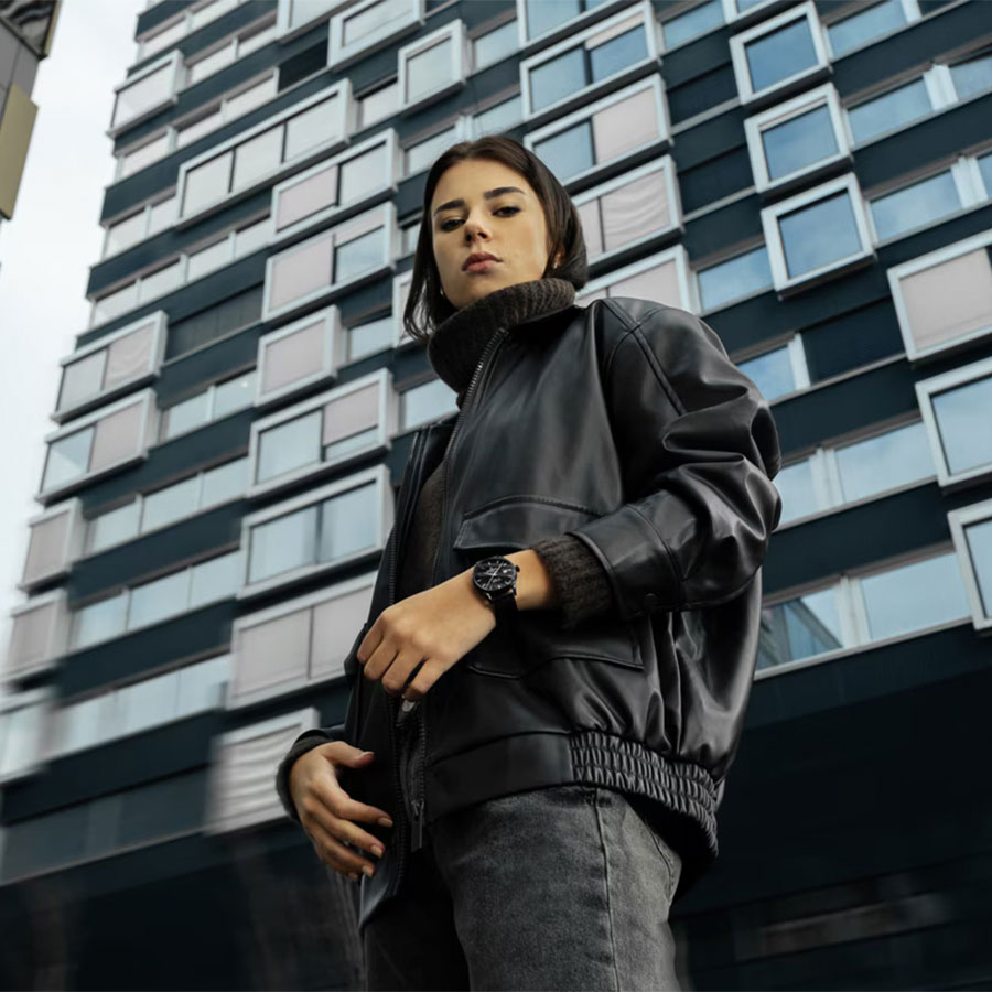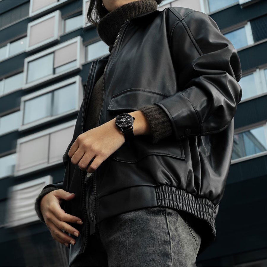 Циферблат глубокого чёрного цвета оформлен с изысканной простотой и защищён сапфировым стеклом с антибликовым покрытием, устойчивым к появлению царапин. Прозрачная задняя крышка позволяет наблюдать за точной работой швейцарского механизма, подчёркивая утончённость исполнения.