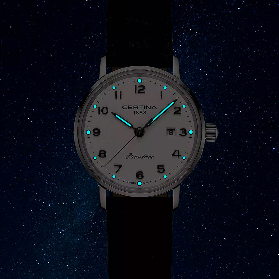 Циферблат белого цвета оформлен с изящной лаконичностью и защищён сапфировым стеклом с антибликовым покрытием, устойчивым к царапинам. Стрелки и метки с люминесцентным напылением Super-LumiNova обеспечивают отличную читаемость даже при слабом освещении.