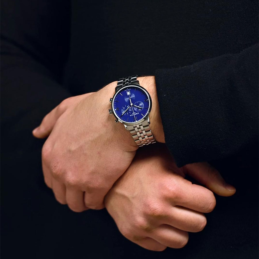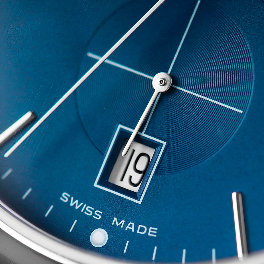 Циферблат насыщенного синего цвета оформлен с декоративной обработкой Sunray, красиво переливаясь при разном освещении. Установлено сапфировое стекло с антибликовым покрытием, устойчивое к появлению царапин. Люминесцентные стрелки и метки с покрытием Super-LumiNova обеспечивают отличную читаемость даже в темноте.