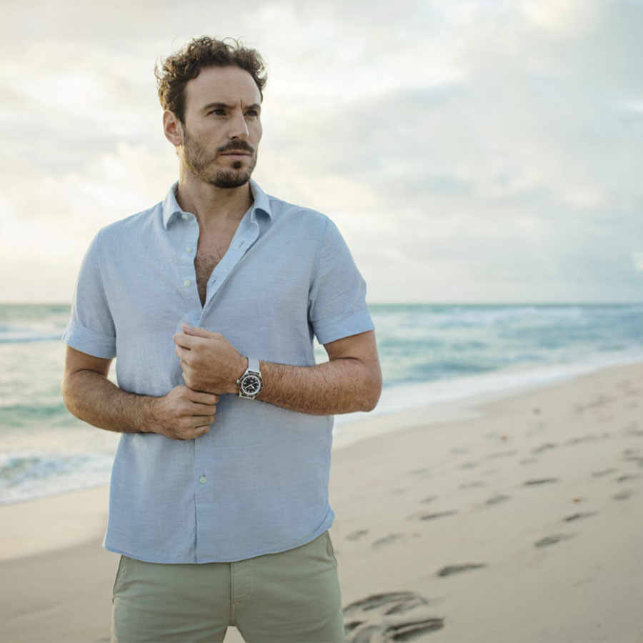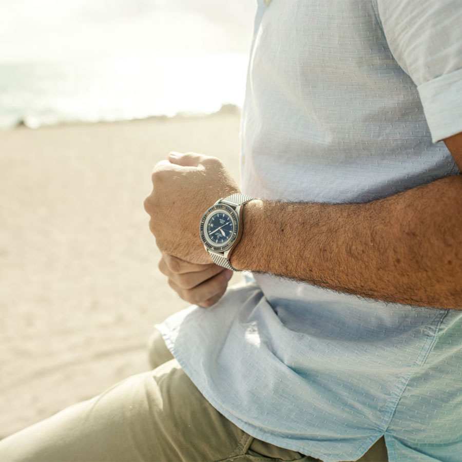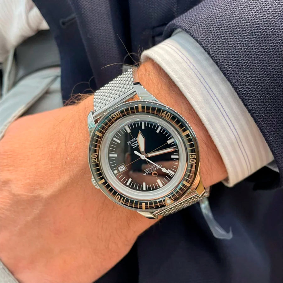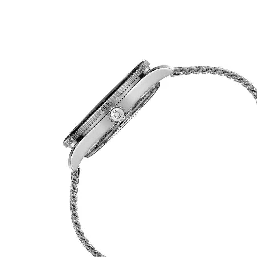 Лакированный циферблат защищён изогнутым сапфировым стеклом с антибликовым покрытием, устойчивым к царапинам. Люминесцентные стрелки и метки с покрытием Super-LumiNova обеспечивают отличную читаемость под водой и в темноте. Однонаправленный вращающийся безель выполнен из керамики, что подчёркивает современность модели.