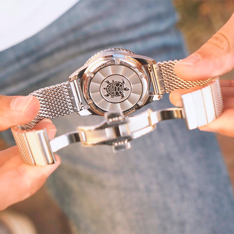 Корпус и браслет миланского плетения изготовлены из нержавеющей стали, придавая часам элегантность и комфорт при ношении. Прозрачная завинчивающаяся задняя крышка позволяет наблюдать за работой механизма, а герметичная заводная головка повышает водонепроницаемость.