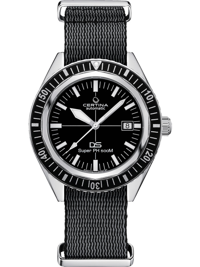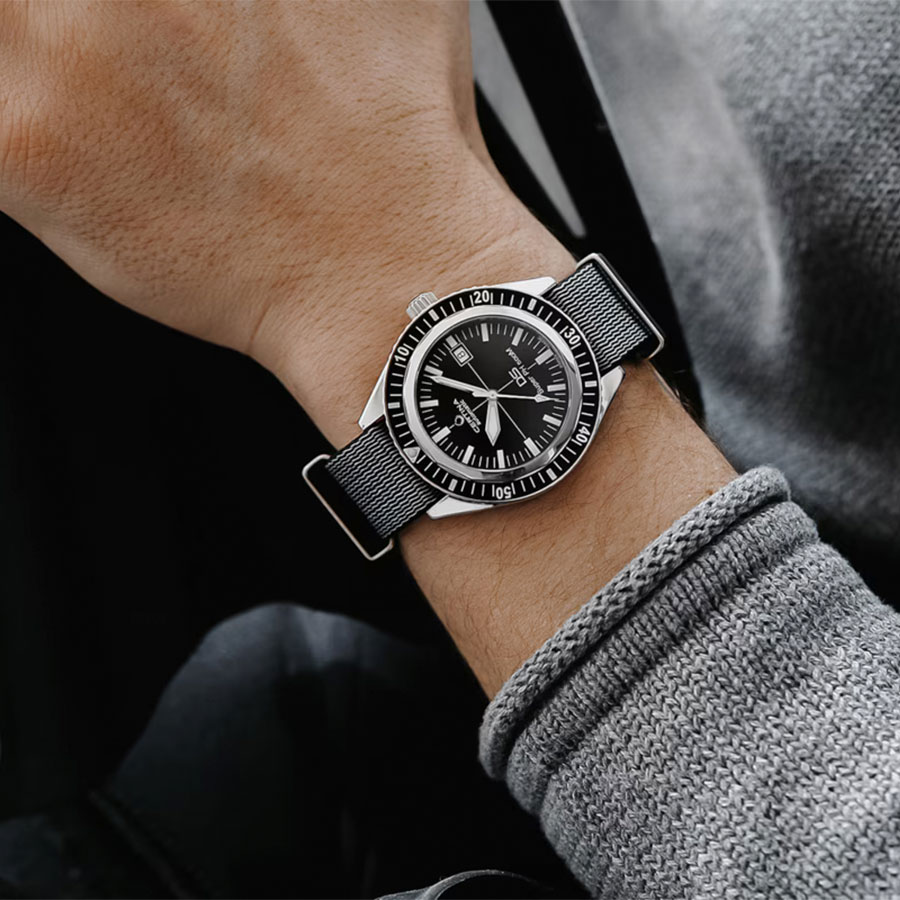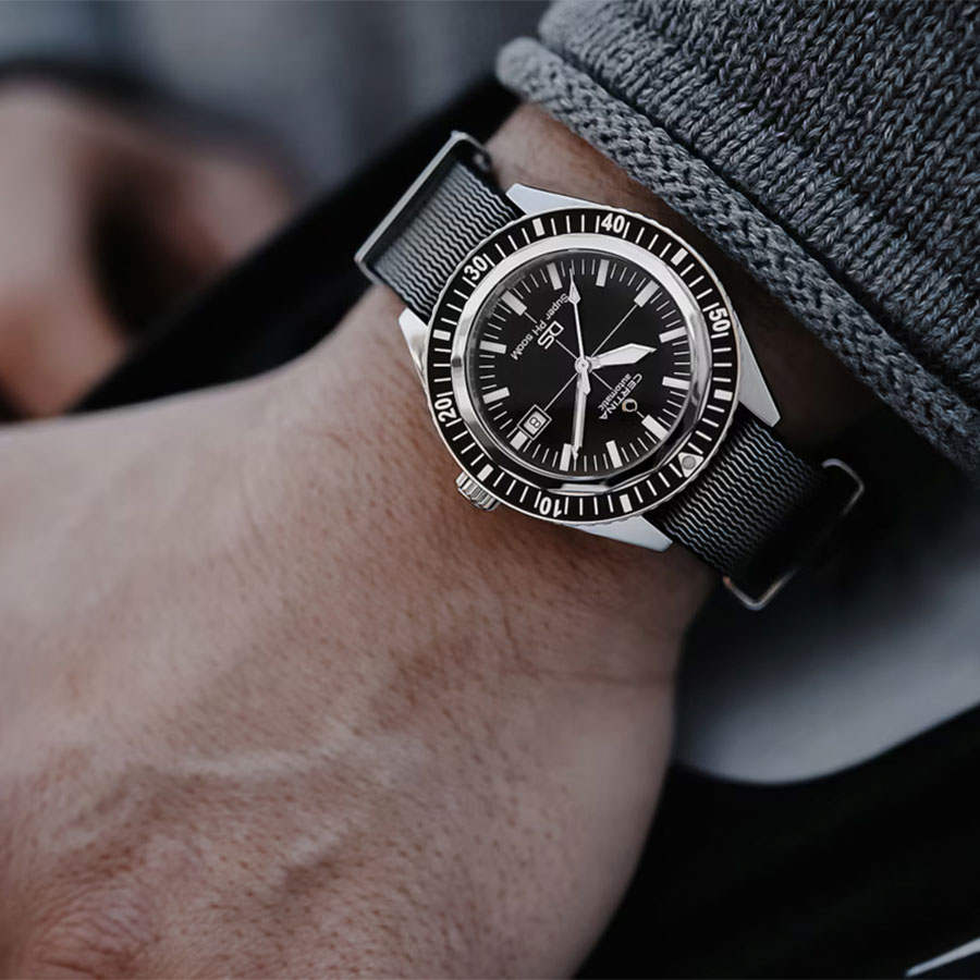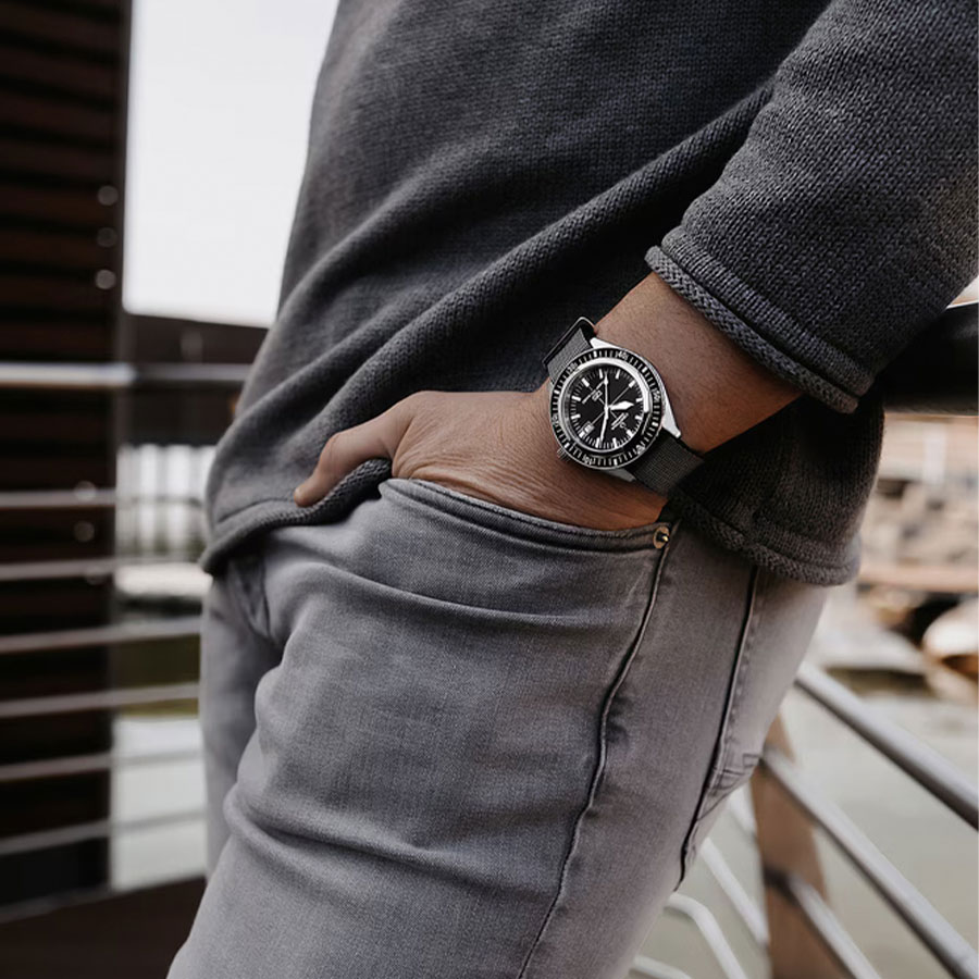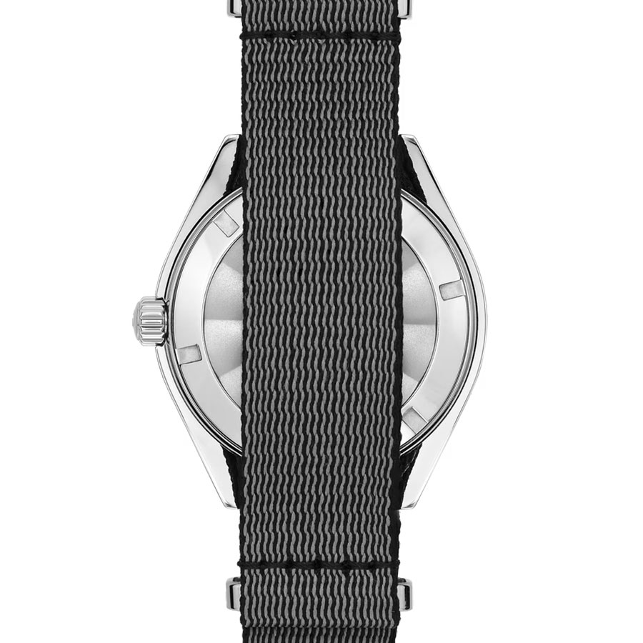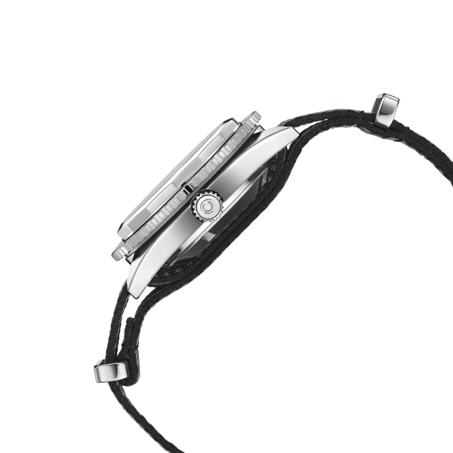 Корпус из нержавеющей стали частично покрыт стойким чёрным PVD-покрытием, придающим модели современный вид и дополнительную износостойкость. Текстильный ремешок обеспечивает комфорт и лёгкость при ношении, а завинчивающиеся заводная головка и задняя крышка усиливают герметичность корпуса.