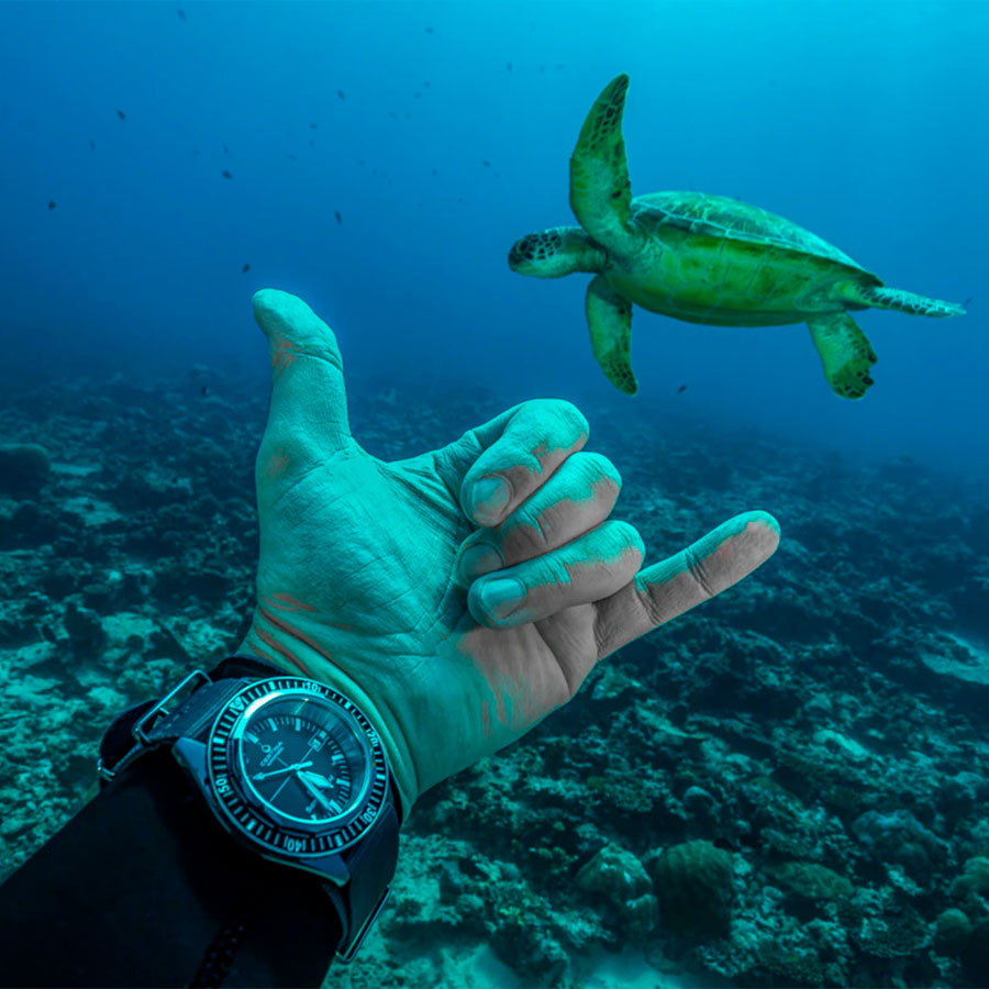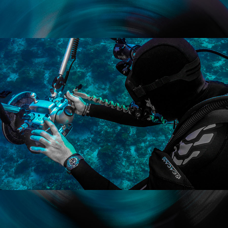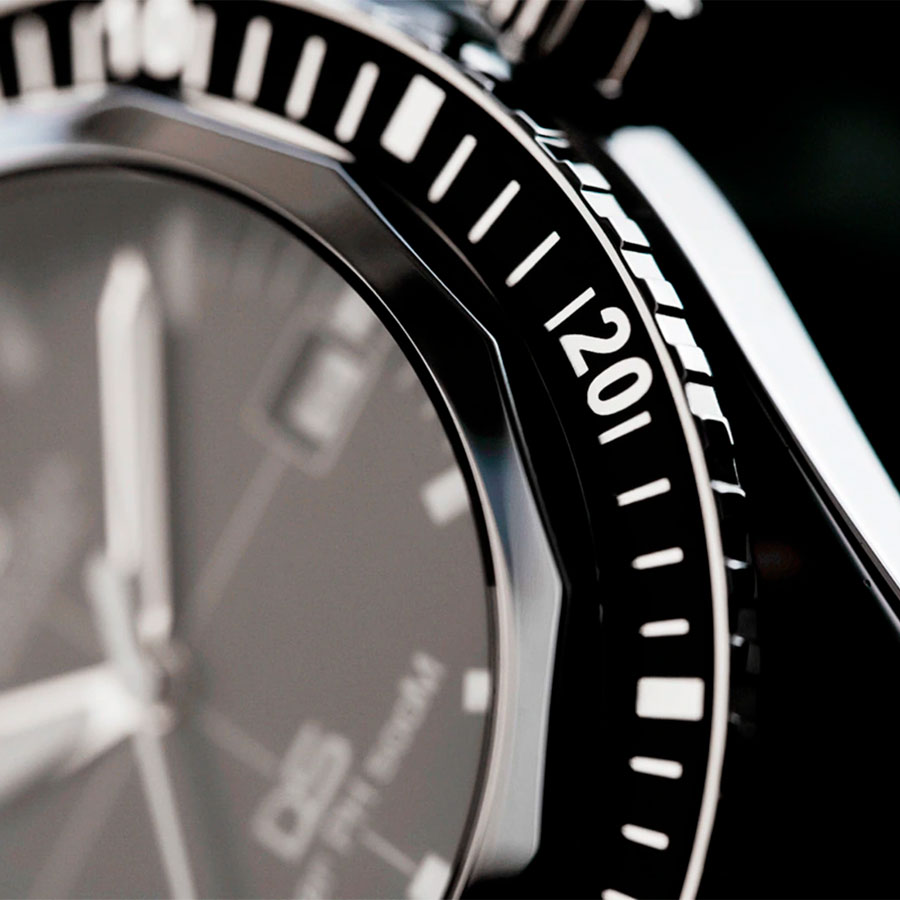 Циферблат глубокого чёрного цвета защищён сапфировым стеклом с антибликовым покрытием, устойчивым к царапинам. Стрелки и метки с люминесцентным покрытием Super-LumiNova обеспечивают отличную видимость под водой. Однонаправленный вращающийся безель помогает точно отслеживать время погружения.