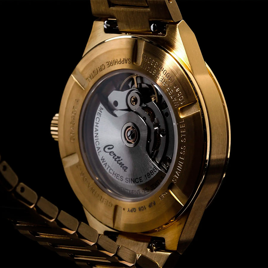 Циферблат защищён устойчивым к царапинам сапфировым стеклом с антибликовым покрытием, обеспечивающим превосходную читаемость. Прозрачная завинчивающаяся задняя крышка позволяет наблюдать за точной работой швейцарского механизма.