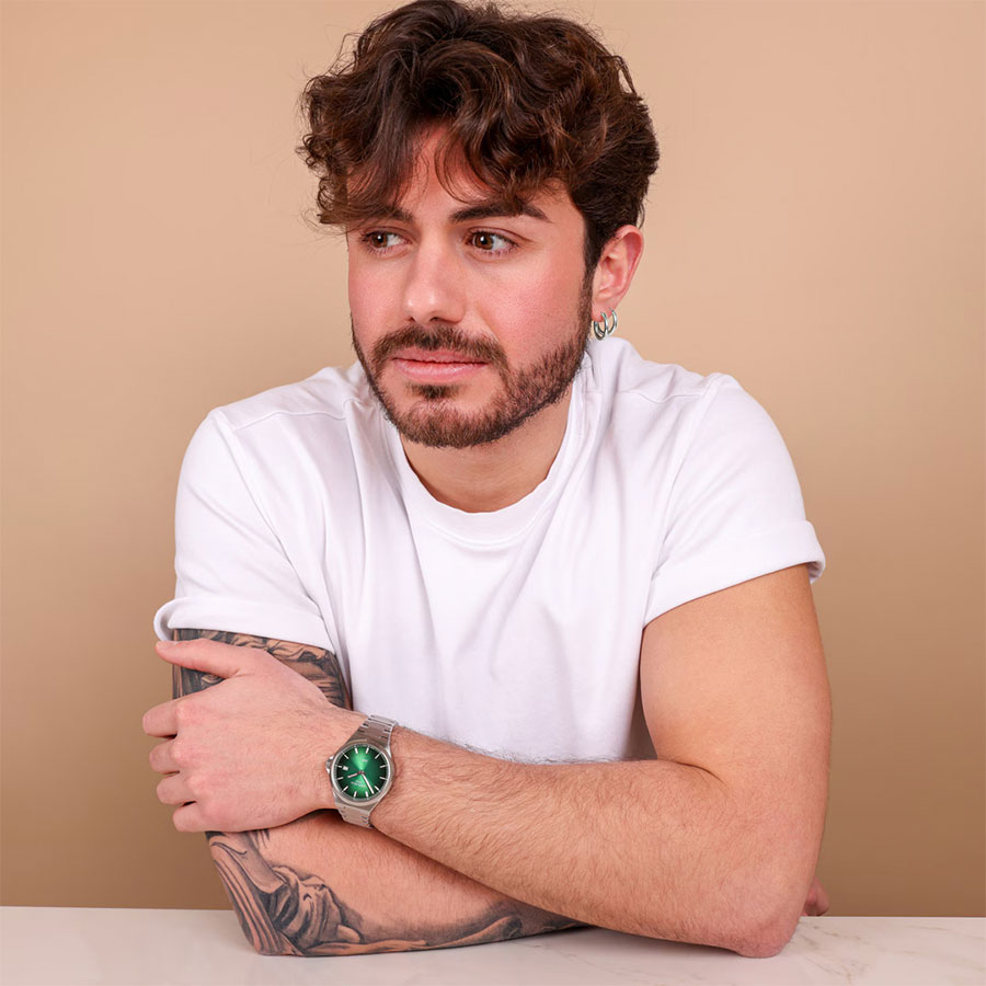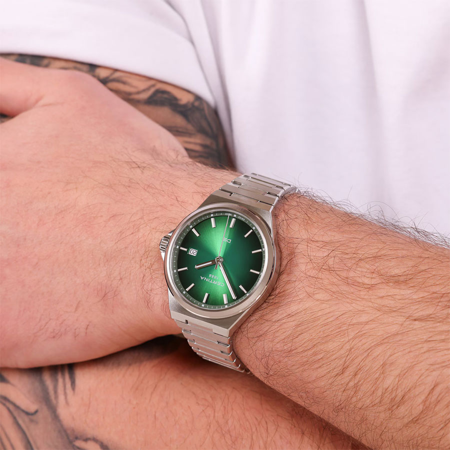 Циферблат насыщенного зелёного цвета выполнен по технологии Sunray (солнечные лучи), создающей эффект глубокого перелива при разном освещении. Его защищает устойчивое к царапинам сапфировое стекло с антибликовым покрытием. Стрелки и метки с люминесцентным покрытием Super-LumiNova® обеспечивают отличную читаемость даже в темноте.