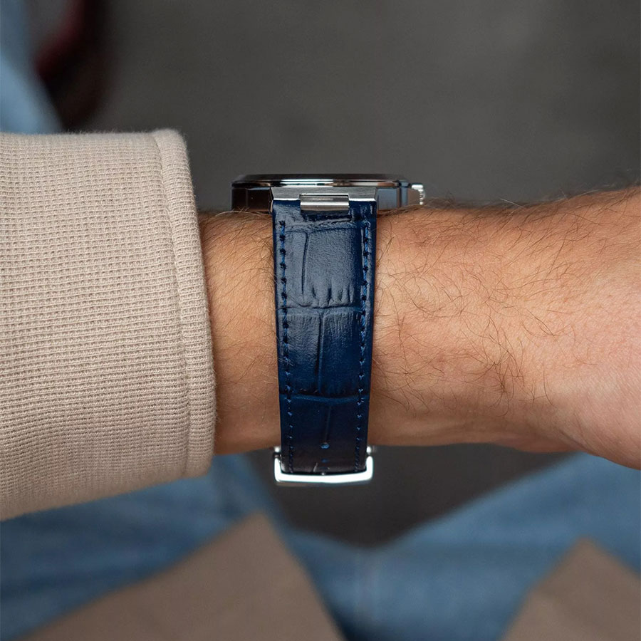 Циферблат насыщенного синего цвета, выполненный по технологии Sunray, эффектно играет на свету. Его защищает устойчивое к царапинам сапфировое стекло с антибликовым покрытием. Стрелки и метки покрыты люминесцентным составом Super-LumiNova®, обеспечивающим отличную читаемость даже в условиях слабого освещения.