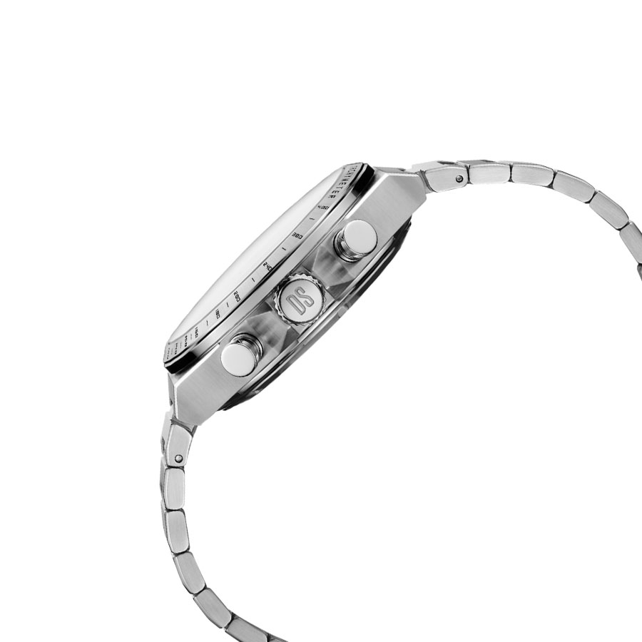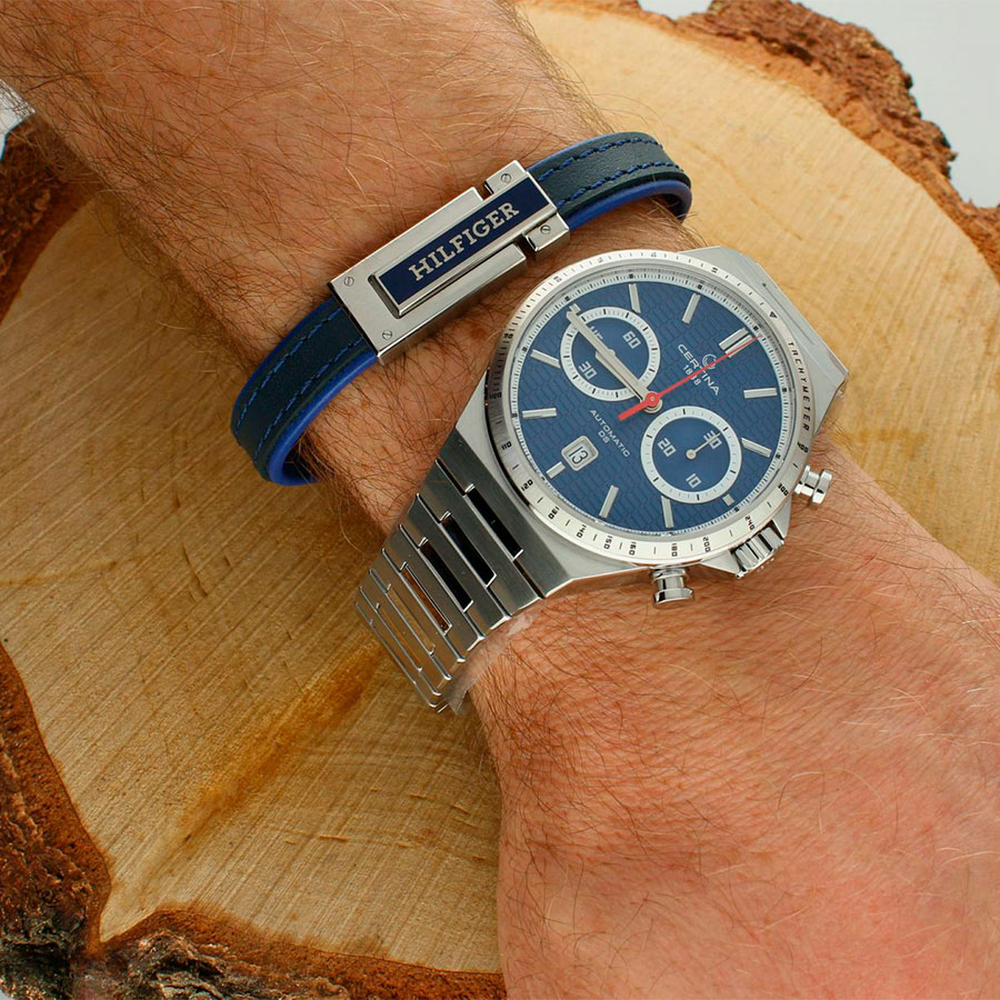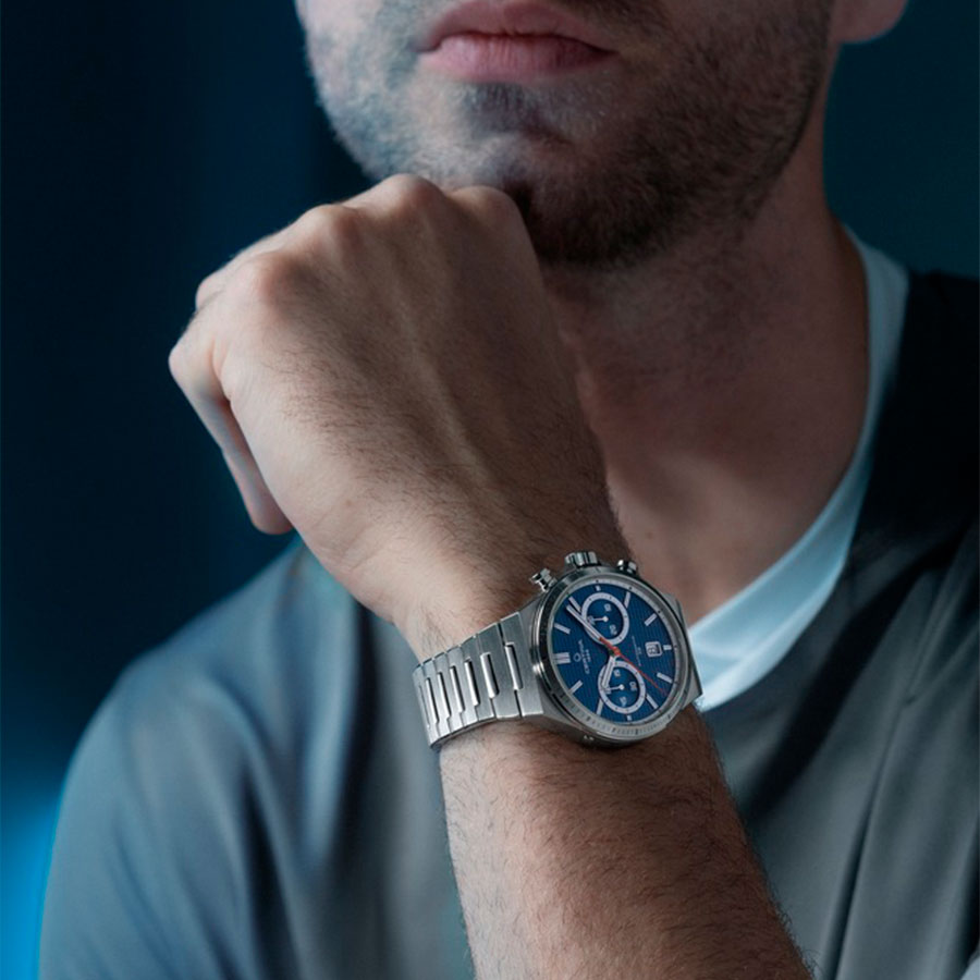 Корпус и браслет выполнены из нержавеющей стали, обеспечивая прочность, комфорт и современный облик. Автоматическая застёжка-клипса «бабочка» гарантирует удобство при ношении. Стрелки и метки с люминесцентным покрытием Super-LumiNova обеспечивают отличную читаемость даже в темноте, а тахиметрическая шкала на безеле позволяет измерять среднюю скорость движения.