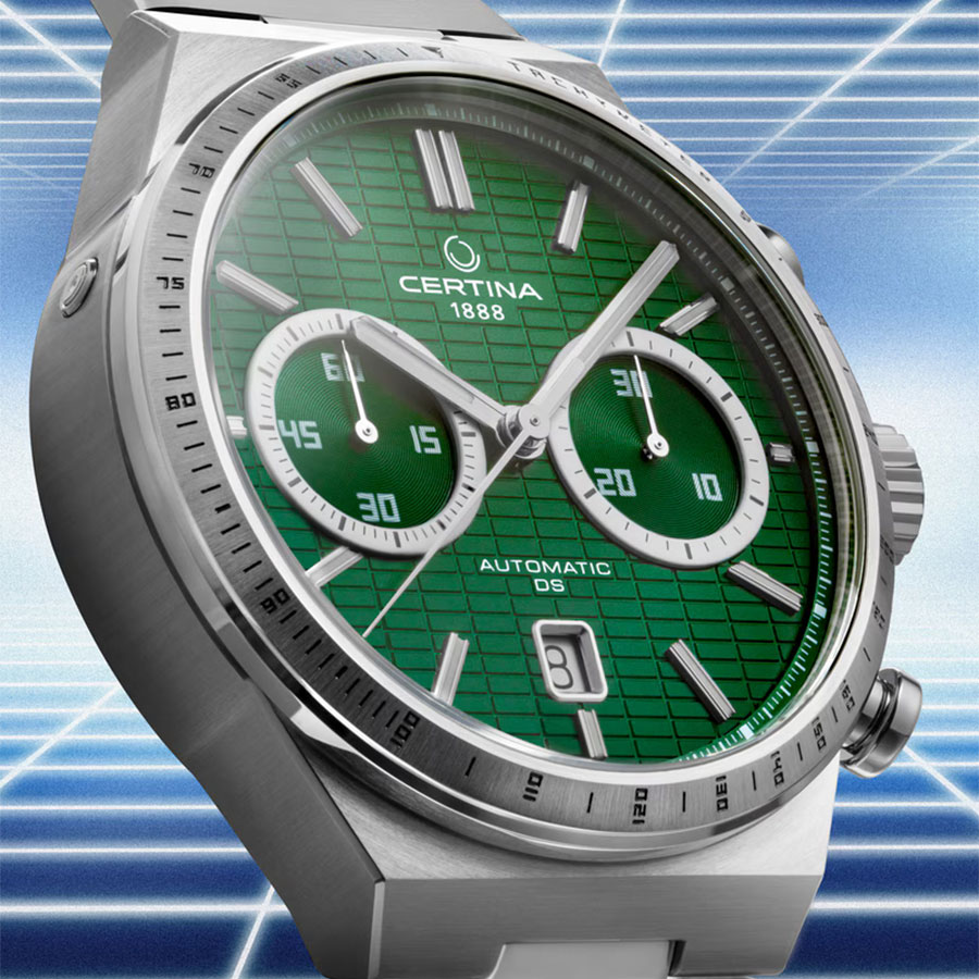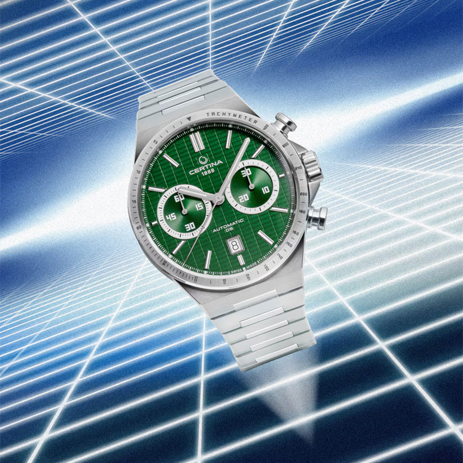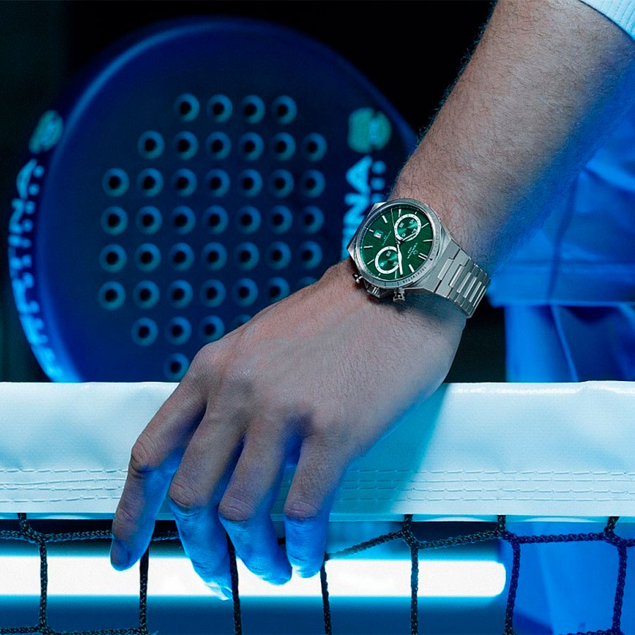 Циферблат насыщенного зелёного оттенка защищён устойчивым к царапинам сапфировым стеклом с антибликовым покрытием, обеспечивающим превосходную читаемость. Прозрачная завинчивающаяся задняя крышка открывает вид на работу механизма, подчёркивая механическую эстетику швейцарского часового искусства.