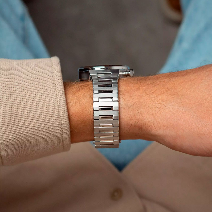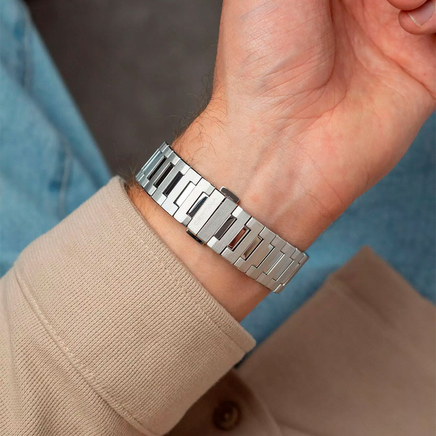 Корпус и литой браслет выполнены из нержавеющей стали, что гарантирует долговечность и комфорт. Автоматическая застёжка-клипса «бабочка» обеспечивает удобную посадку на запястье. Стрелки и метки покрыты люминесцентным составом Super-LumiNova, обеспечивая отличную читаемость даже в условиях недостаточного освещения. На безеле присутсвует шкала тахиметра для измерения средней скорости движения.