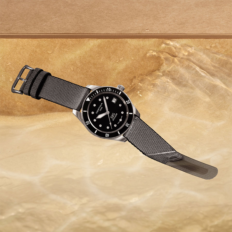 Модель оснащена текстильным ремешком, который сочетает комфорт и стиль. Водонепроницаемость WR100 (10 атм) делает часы подходящими для плавания и активного отдыха.