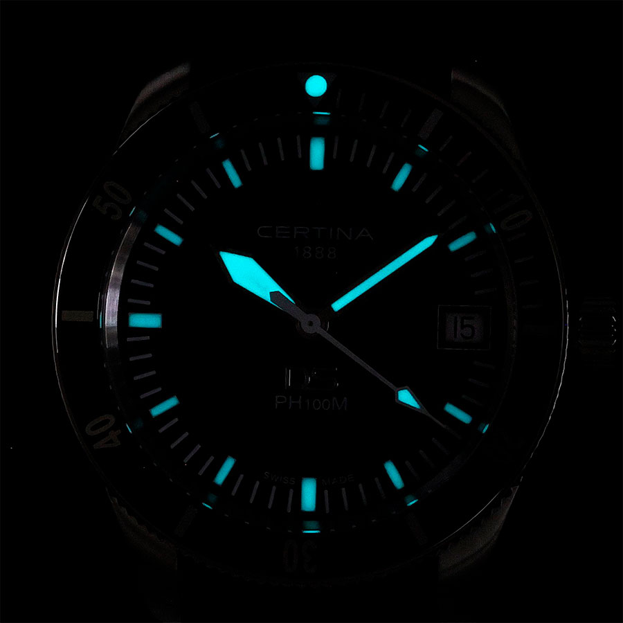Циферблат защищён устойчивым к царапинам сапфировым стеклом с антибликовым покрытием, а стрелки и метки покрыты люминесцентным составом Super-LumiNova, обеспечивающим превосходную читаемость даже в темноте.