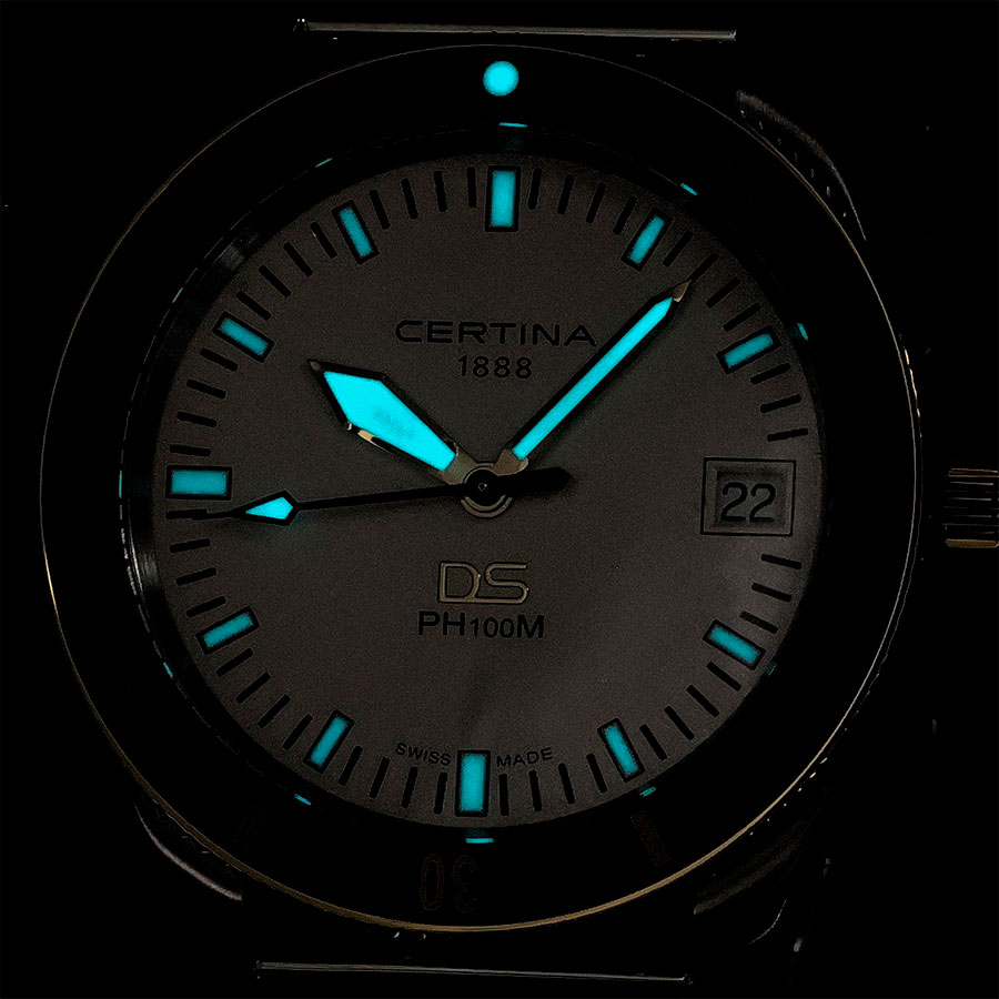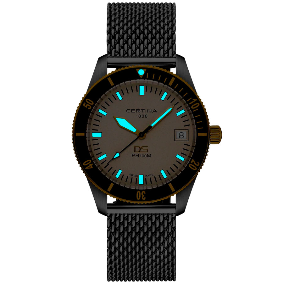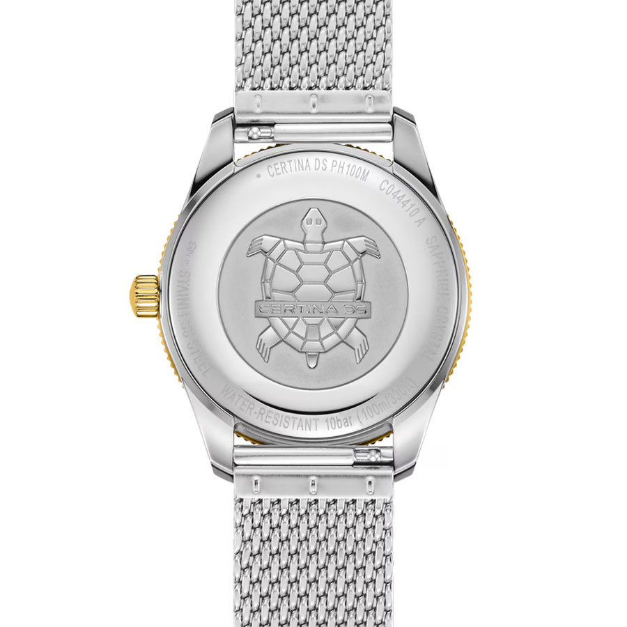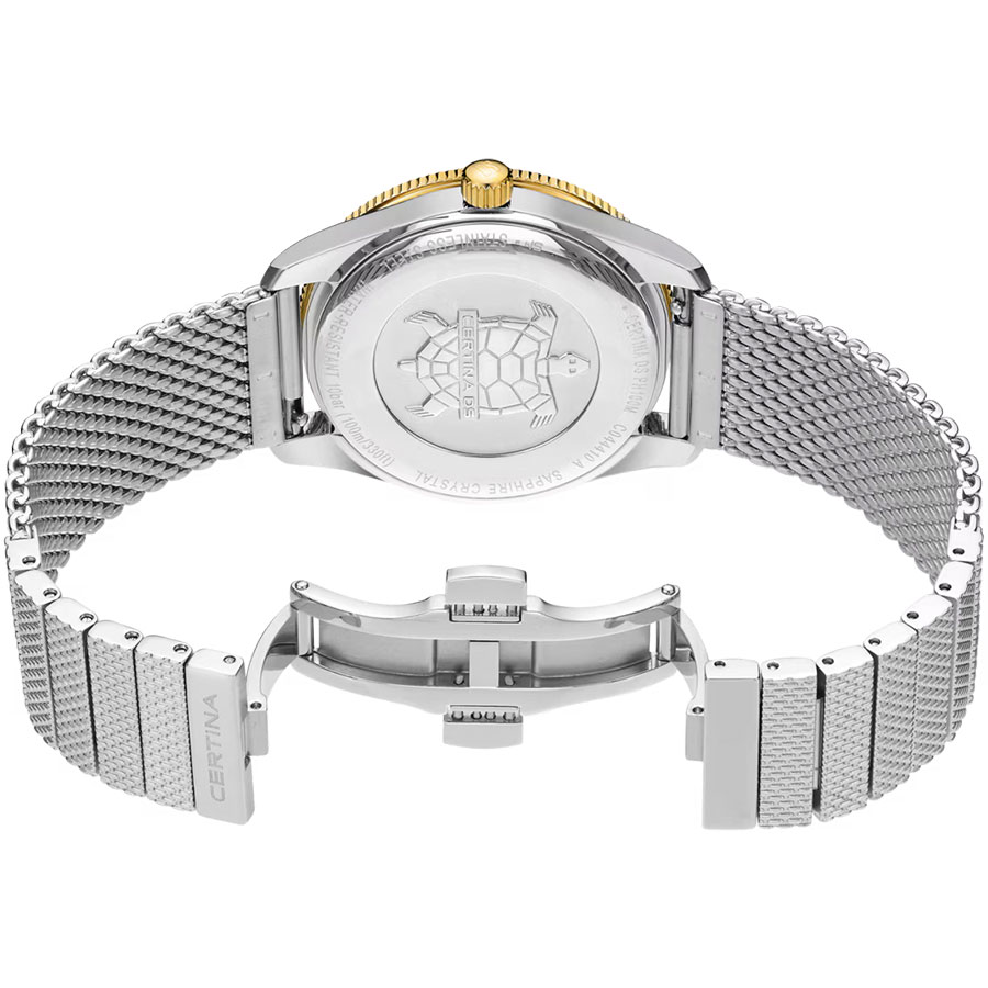 В основе часов лежит калибр ETA F07.412 (Swiss Made) с технологией Certina Precidrive, обеспечивающей точность до ±10 секунд в год — это почти в 10 раз выше, чем у стандартных кварцевых механизмов. Также предусмотрен индикатор окончания срока службы батареи и функция отображения даты.