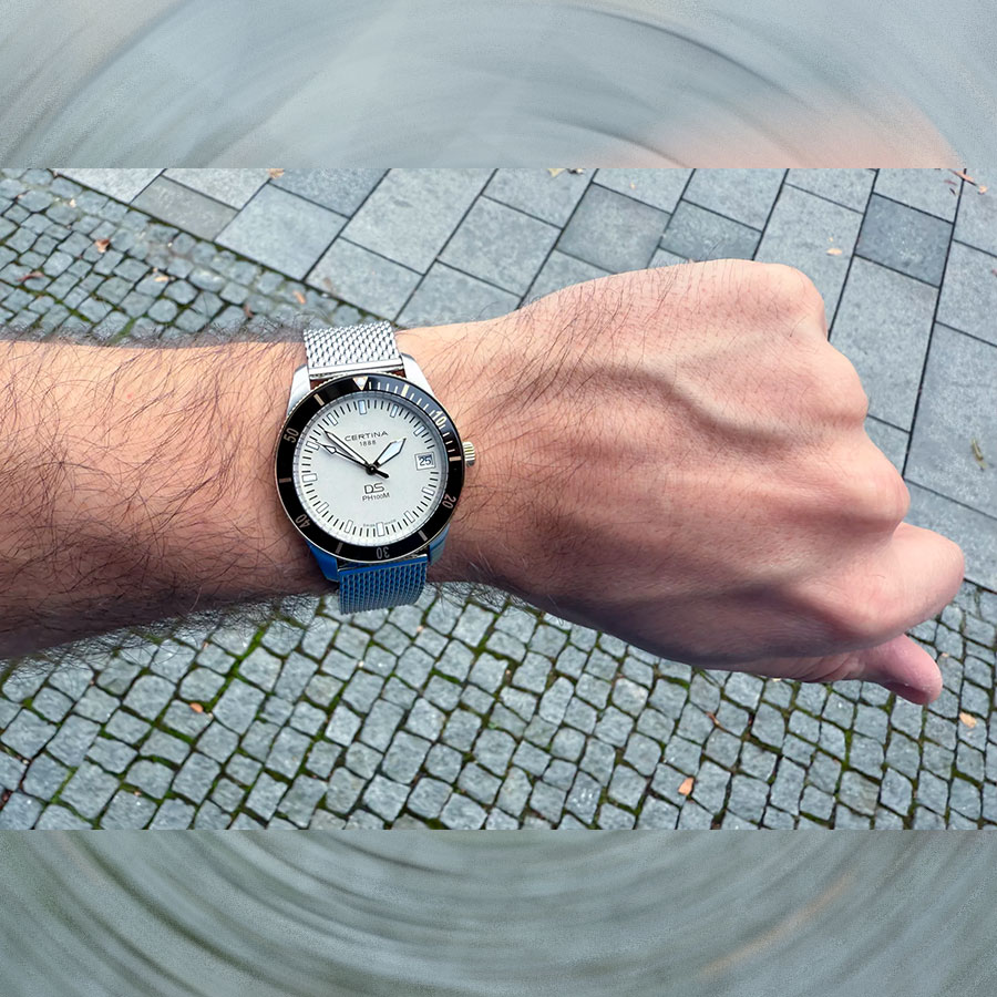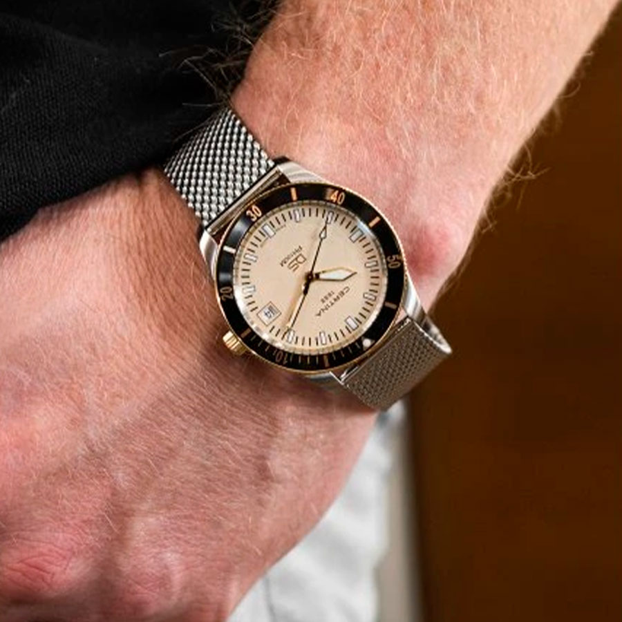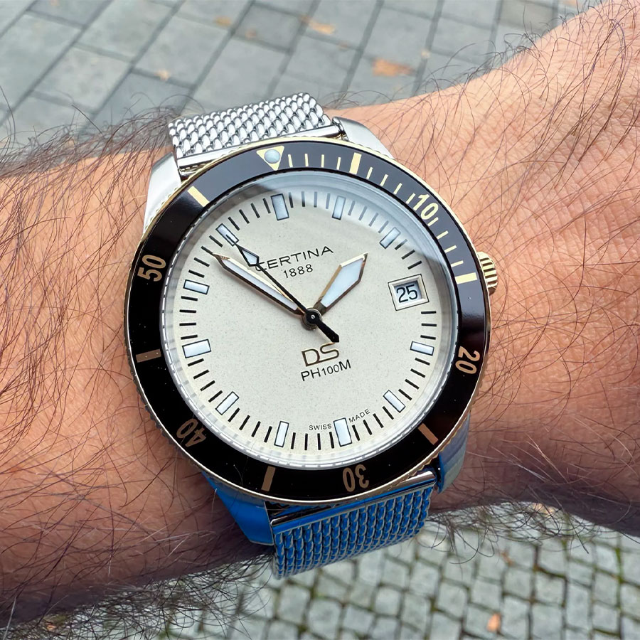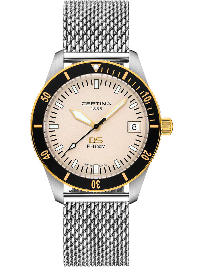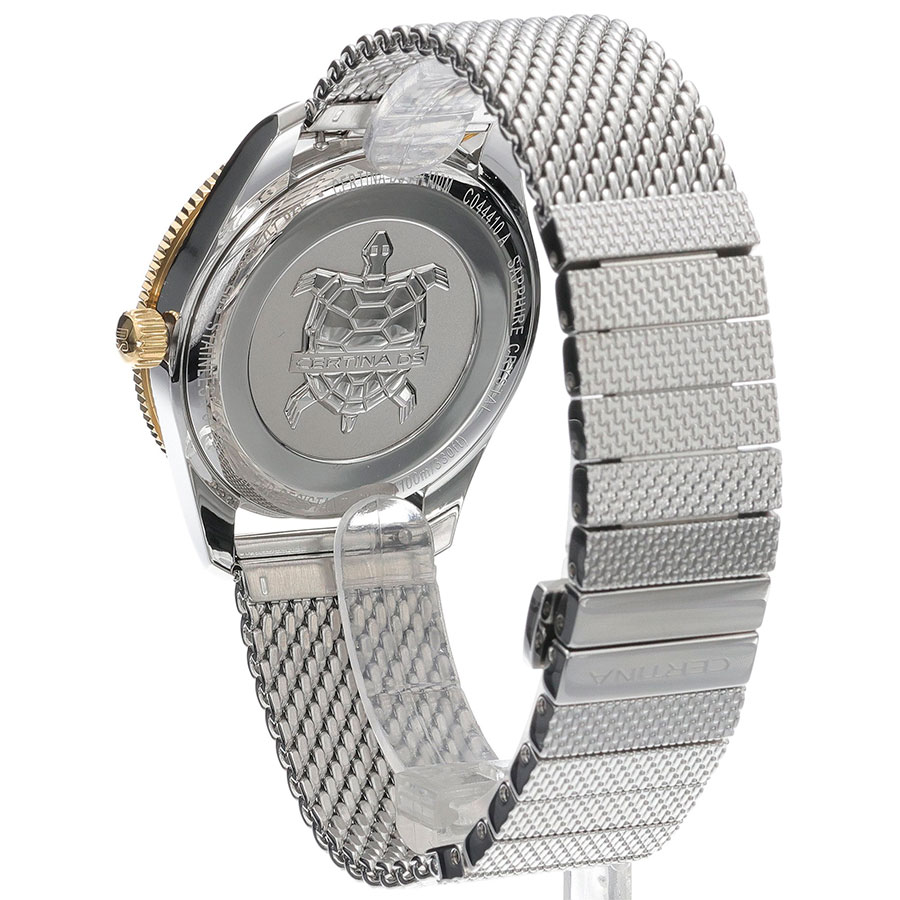 В основе часов лежит калибр ETA F07.412 (Swiss Made) с технологией Certina Precidrive, обеспечивающей точность до ±10 секунд в год — это почти в 10 раз выше, чем у стандартных кварцевых механизмов. Также предусмотрен индикатор окончания срока службы батареи и функция отображения даты.