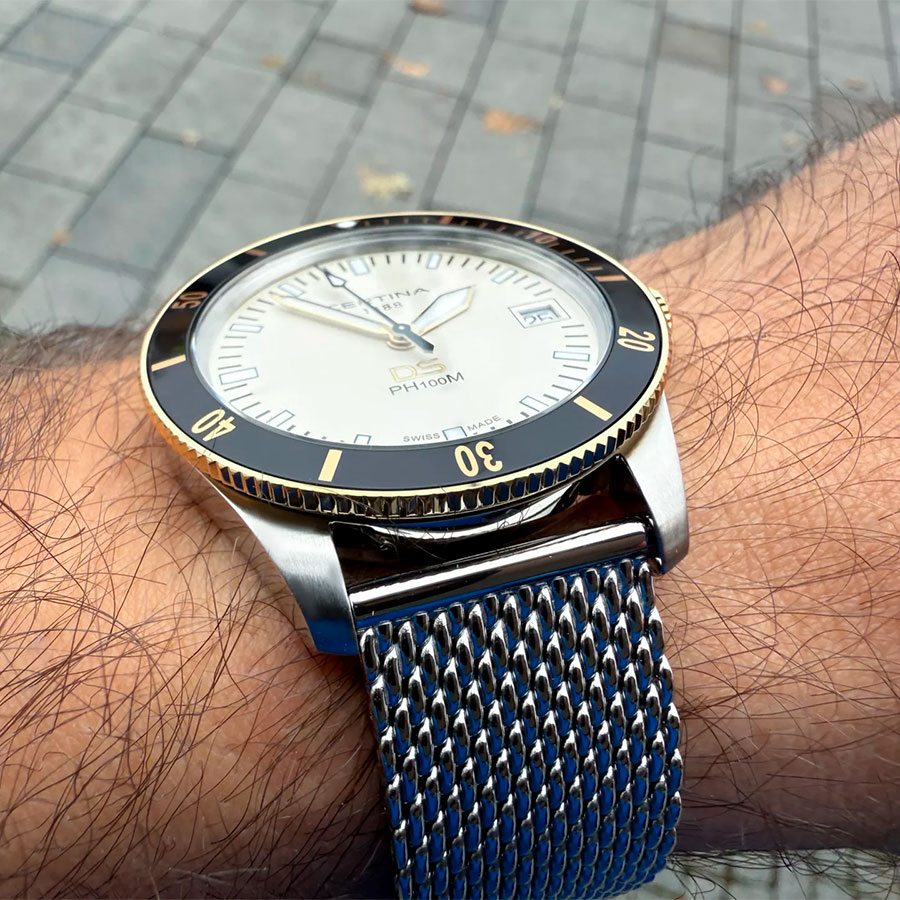 Корпус и браслет миланского плетения выполнены из нержавеющей стали, обеспечивая долговечность, комфорт и утончённый внешний вид.
