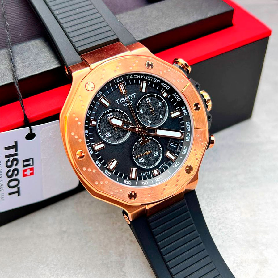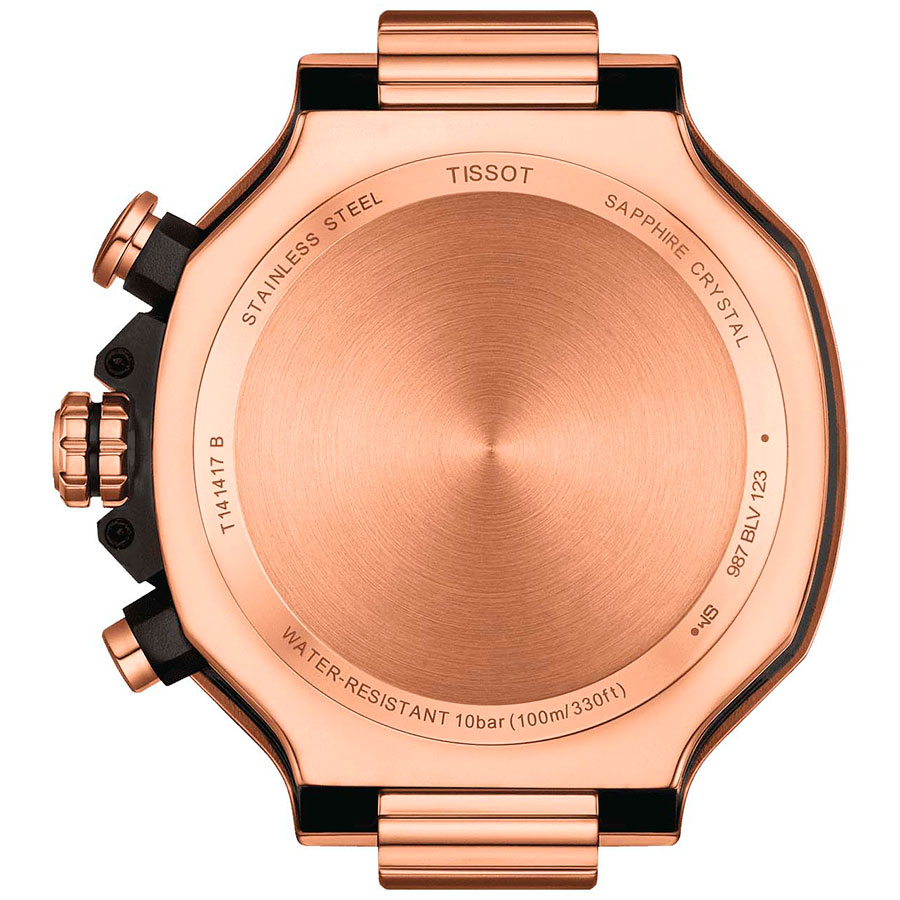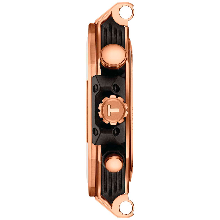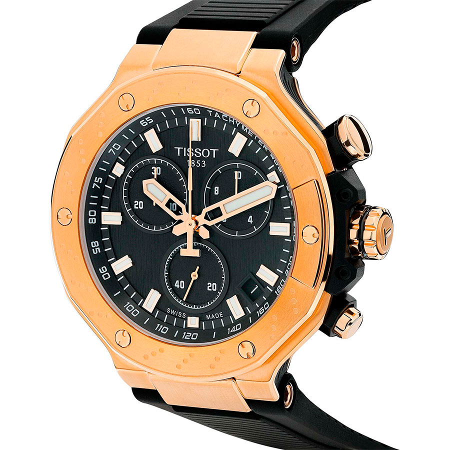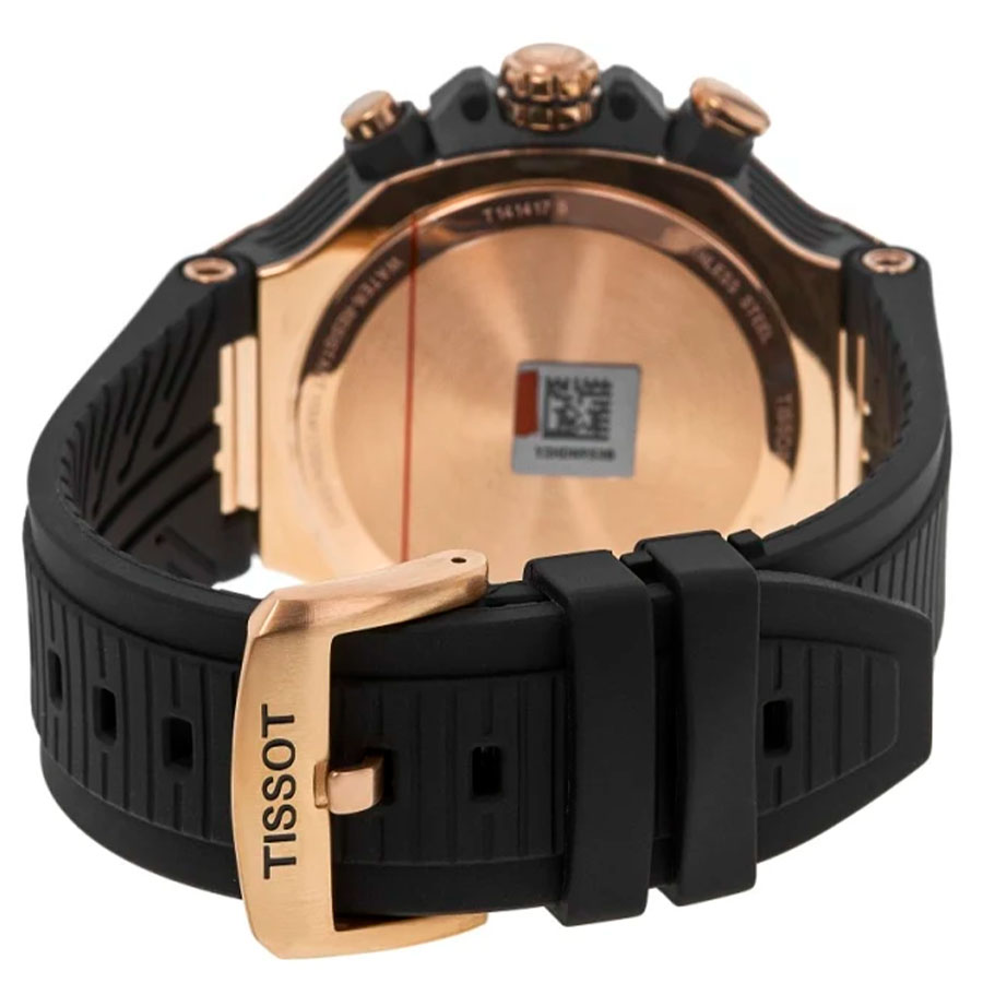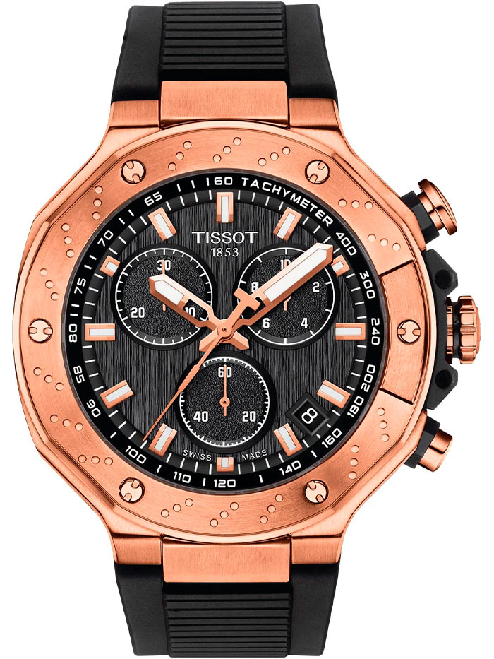 Мужские кварцевые наручные часы с хронографом (секундомером) TISSOT  T-Race MotoGP Chronograph T141.417.37.051.00 коллекции T Sport. Калибр механизма — ETA G10.212. На данной модели отображается текущая дата. Секундомер может отсчитывать до 29 минут 59 секунд. На циферблате присутсвует шкала тахиметра для измерения средней скорости движения. Стрелки и метки покрыты люминесцентным напылением Super-LumiNova® (светятся в темноте). Сапфировое стекло с антибликовым покрытием, устойчивое к появлению царапин. Полимерный ремешок. На корпус нанесено стойкое PVD покрытие. Водонепроницаемость WR100 (10 атм). Размеры корпуса: (ШxТ) 45х11.7 мм. Гарантийный срок — 3 года (1 год от производителя + 2 года от магазина).
