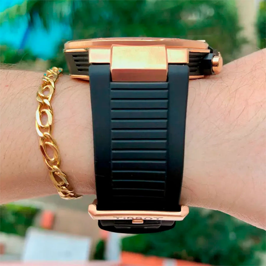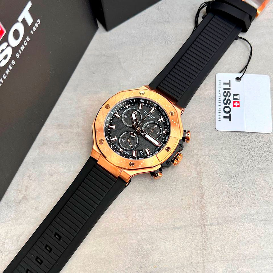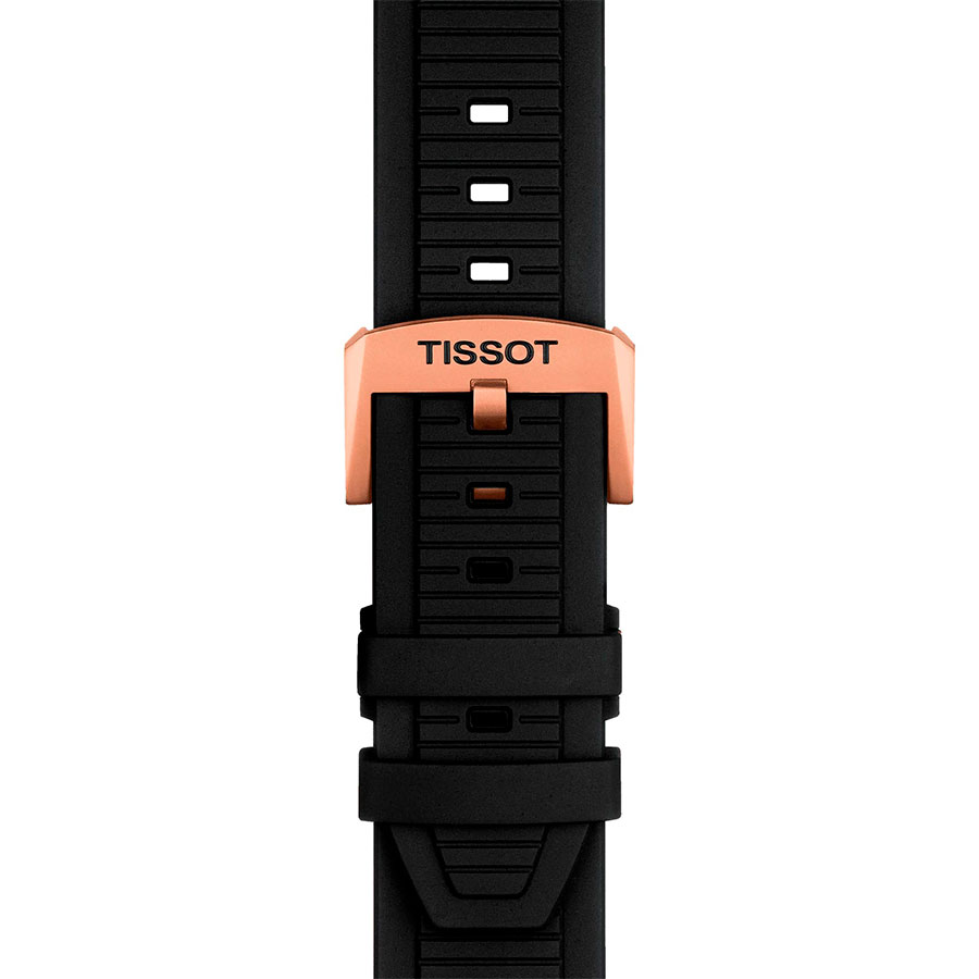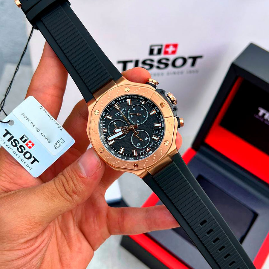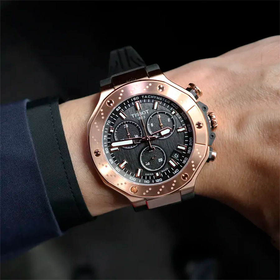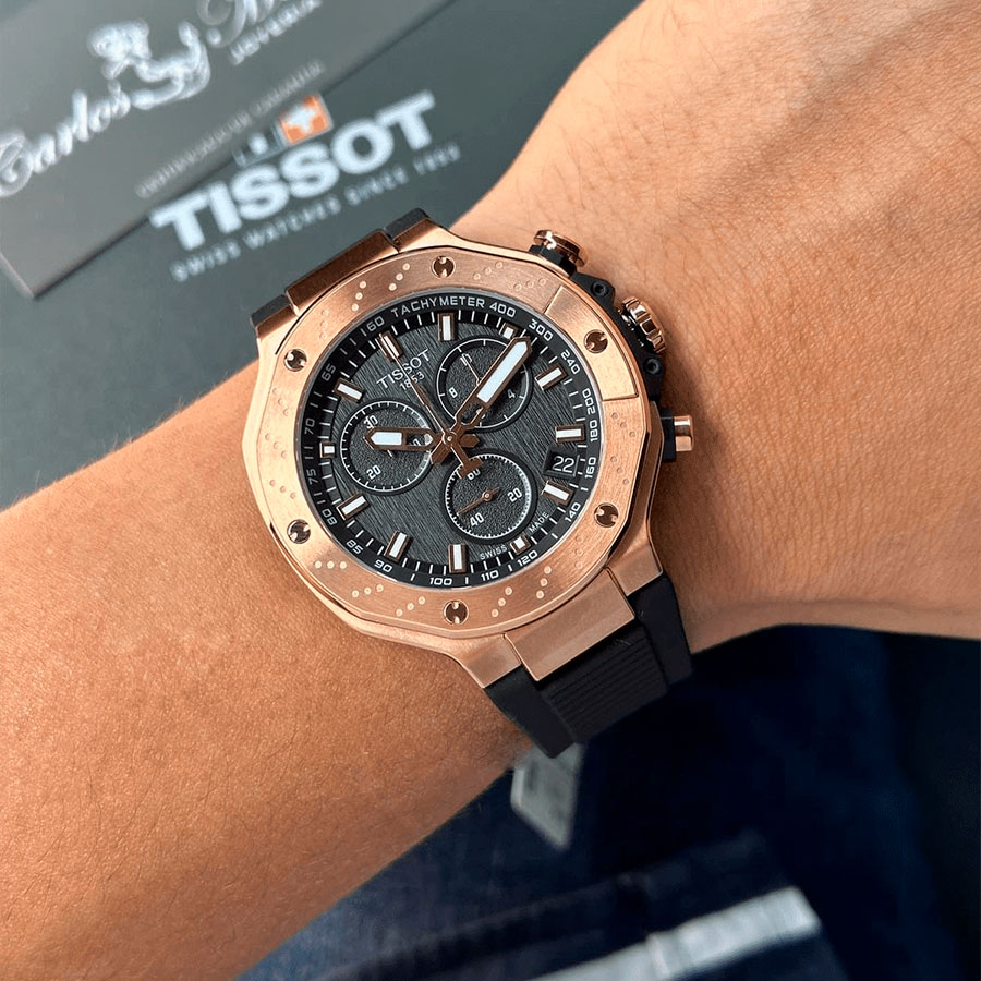 Мужские кварцевые наручные часы с хронографом (секундомером) TISSOT  T-Race MotoGP Chronograph T141.417.37.051.00 коллекции T Sport. Калибр механизма — ETA G10.212. На данной модели отображается текущая дата. Секундомер может отсчитывать до 29 минут 59 секунд. На циферблате присутсвует шкала тахиметра для измерения средней скорости движения. Стрелки и метки покрыты люминесцентным напылением Super-LumiNova® (светятся в темноте). Сапфировое стекло с антибликовым покрытием, устойчивое к появлению царапин. Полимерный ремешок. На корпус нанесено стойкое PVD покрытие. Водонепроницаемость WR100 (10 атм). Размеры корпуса: (ШxТ) 45х11.7 мм. Гарантийный срок — 3 года (1 год от производителя + 2 года от магазина).