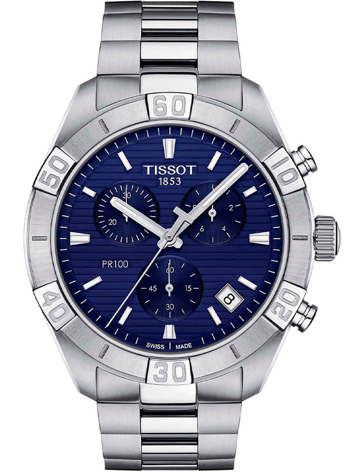 Мужские кварцевые наручные часы с хронографом (секундомером) TISSOT PR 100 Sport Gent Chronograph T101.617.11.041.00 коллекции T Classic. Калибр механизма — G10.212 AA PRECIDRIVE. На данной модели отображается текущая дата. Секундомер может отсчитывать до 29 минут 59 секунд. Стрелки покрыты люминесцентным напылением (светятся в темноте). Сапфировое стекло с антибликовым покрытием, устойчивое к появлению царапин. Стальной браслет. Водонепроницаемость WR100 (10 атм). Размеры корпуса: (ШxТ) 44x11 мм. Гарантийный срок — 3 года (1 год от производителя + 2 года от магазина).