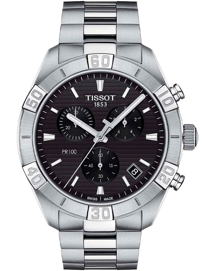 Мужские кварцевые наручные часы с хронографом (секундомером) TISSOT PR 100 Sport Gent Chronograph T101.617.11.051.00 коллекции T Classic. Калибр механизма — G10.212 AA PRECIDRIVE. На данной модели отображается текущая дата. Секундомер может отсчитывать до 29 минут 59 секунд. Стрелки покрыты люминесцентным напылением (светятся в темноте). Сапфировое стекло с антибликовым покрытием, устойчивое к появлению царапин. Стальной браслет. Водонепроницаемость WR100 (10 атм). Размеры корпуса: (ШxТ) 44x11 мм. Гарантийный срок — 3 года (1 год от производителя + 2 года от магазина).