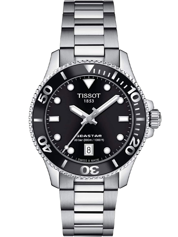 Кварцевые наручные часы TISSOT Seastar 1000 T120.210.11.051.00 коллекции T Sport. Калибр механизма — ETA F05.111. На данной модели отображается текущая дата. Стрелки и метки покрыты люминесцентным напылением Super-LumiNova® (светятся в темноте). Сапфировое стекло с антибликовым покрытием, устойчивое к появлению царапин. Завинчивающиеся заводная головка и задняя крышка. Однонаправленный вращающийся безель со вставкой из минерального стекла. Стальной браслет с системой быстрой замены и возможностью быстрого удлинения для удобного использования с гидрокостюмом. В комплекте идет дополнительный силиконовый ремешок. Водонепроницаемость WR300 (30 атм). Размеры корпуса: (ШxТ) 36x9.7 мм. Гарантийный срок — 3 года (1 год от производителя + 2 года от магазина).