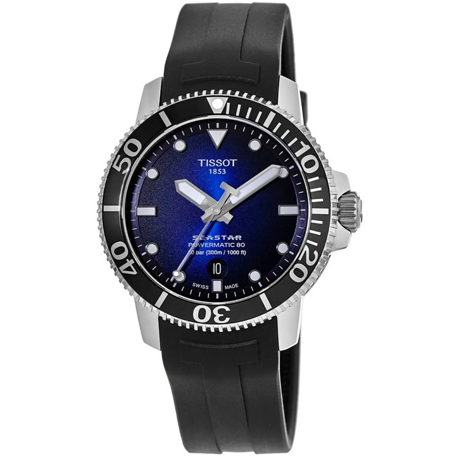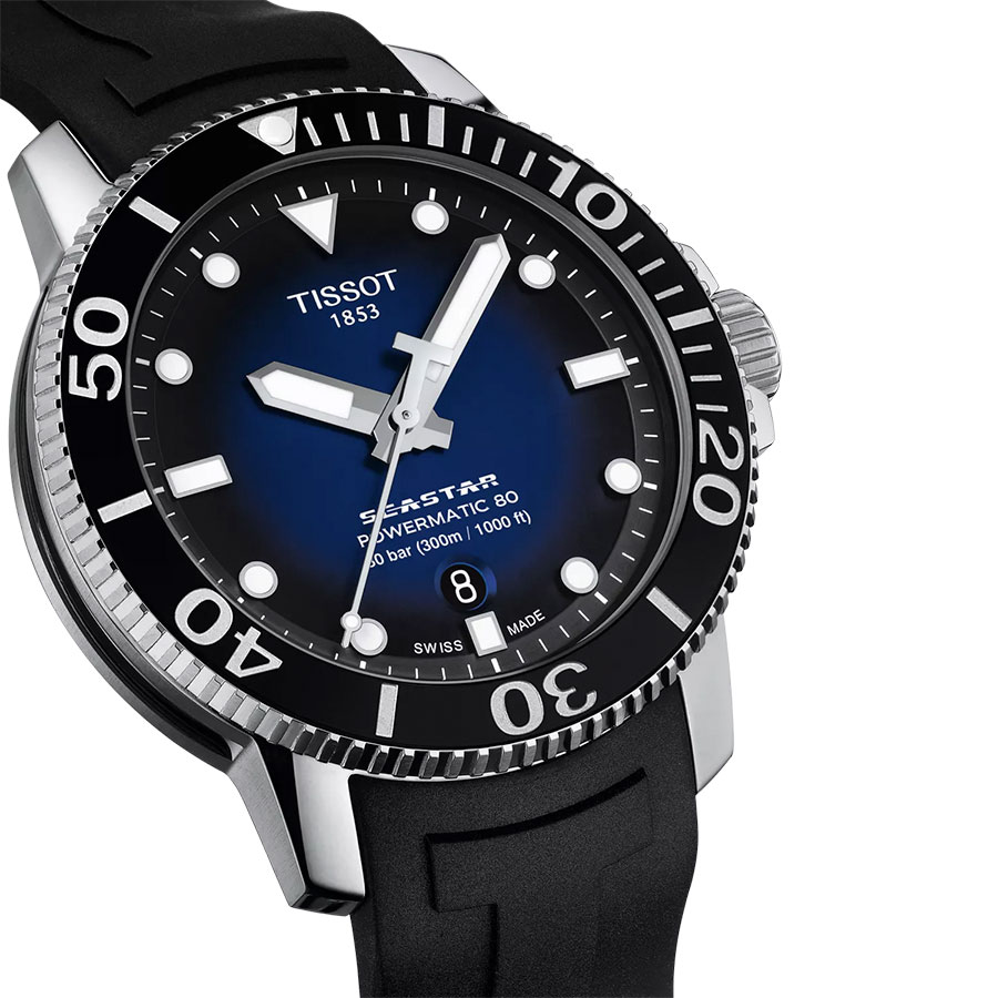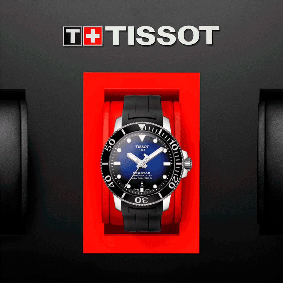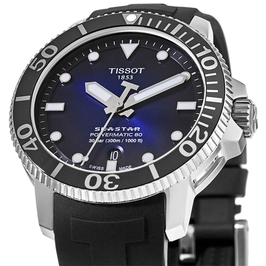 Мужские механические наручные часы TISSOT Seastar 1000 Powermatic 80 T120.407.17.041.00 коллекции T Sport с автоподзаводом и возможностью ручного завода. Калибр механизма — Powermatic 80.111. В механизме часов использована запатентованная балансирная пружина Nivachron, благодаря чему запас хода значительно увеличен и составляет не менее 80-ти часов. Количество камней - 23. Функция стоп-секунда (остановка секундной стрелки для установки точного времени). На данной модели отображается текущая дата. Стрелки и метки покрыты люминесцентным напылением Super-LumiNova® (светятся в темноте). Сапфировое стекло с антибликовым покрытием, устойчивое к появлению царапин. Прозрачная задняя крышка. Завинчивающиеся заводная головка и задняя крышка. Однонаправленный вращающийся безель с керамической вставкой. Полимерный ремешокВодонепроницаемость WR300 (30 атм). Размеры корпуса: (ШxТ) 43x12.7 мм. Гарантийный срок — 3 года (1 год от производителя + 2 года от магазина).