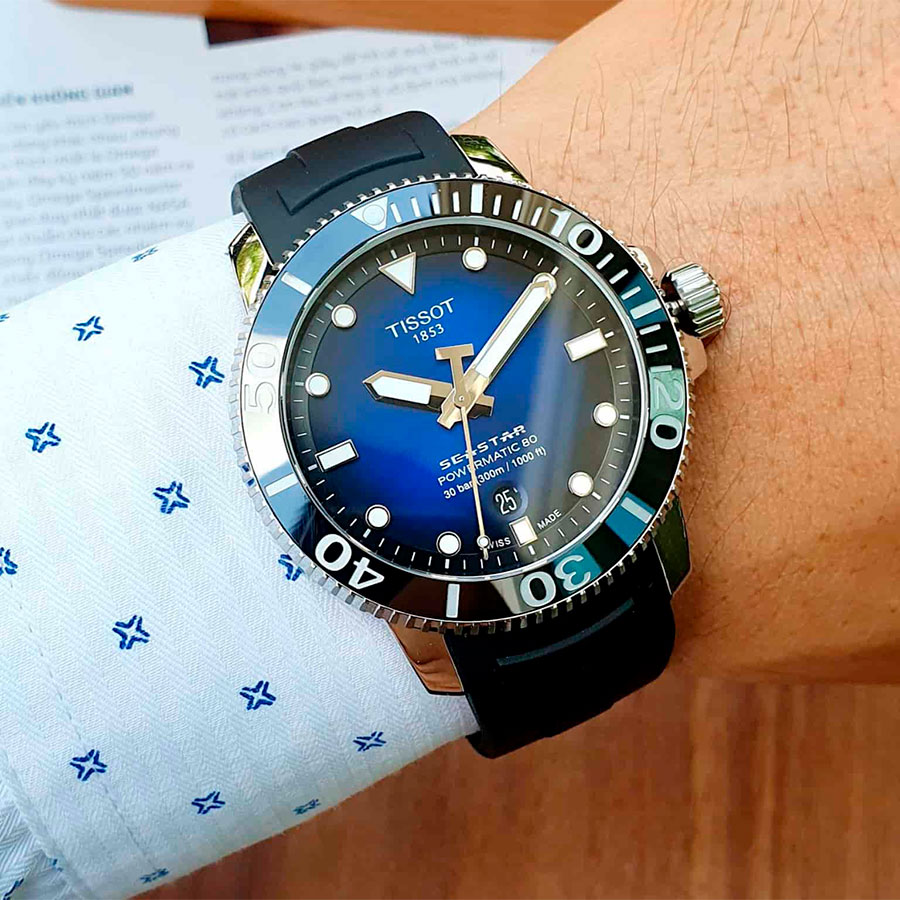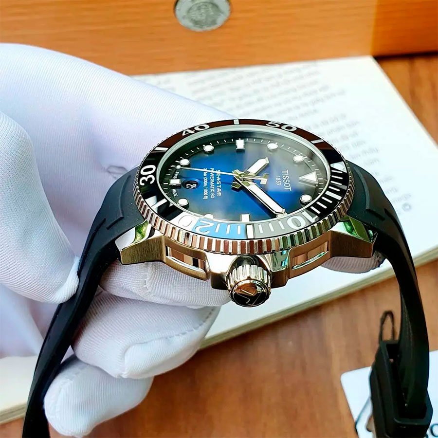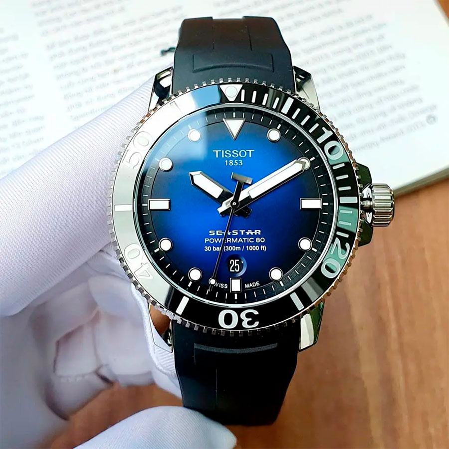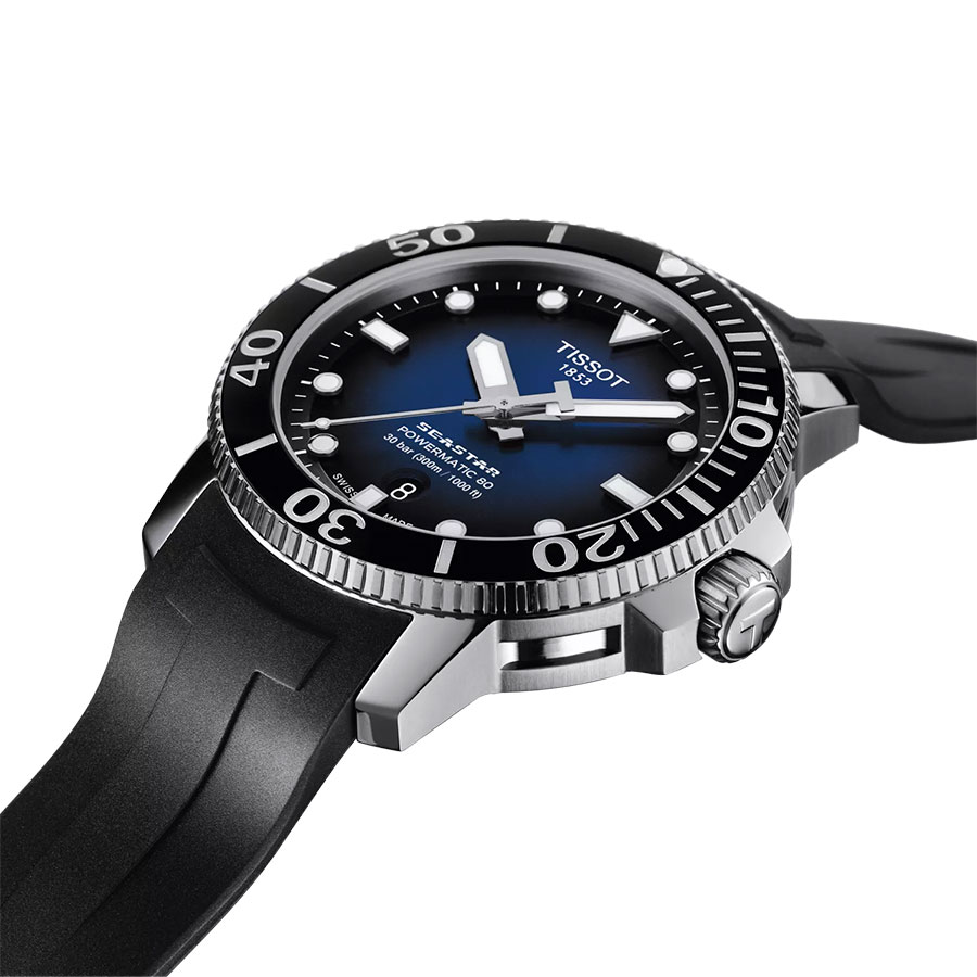 Мужские механические наручные часы TISSOT Seastar 1000 Powermatic 80 T120.407.17.041.00 коллекции T Sport с автоподзаводом и возможностью ручного завода. Калибр механизма — Powermatic 80.111. В механизме часов использована запатентованная балансирная пружина Nivachron, благодаря чему запас хода значительно увеличен и составляет не менее 80-ти часов. Количество камней - 23. Функция стоп-секунда (остановка секундной стрелки для установки точного времени). На данной модели отображается текущая дата. Стрелки и метки покрыты люминесцентным напылением Super-LumiNova® (светятся в темноте). Сапфировое стекло с антибликовым покрытием, устойчивое к появлению царапин. Прозрачная задняя крышка. Завинчивающиеся заводная головка и задняя крышка. Однонаправленный вращающийся безель с керамической вставкой. Полимерный ремешокВодонепроницаемость WR300 (30 атм). Размеры корпуса: (ШxТ) 43x12.7 мм. Гарантийный срок — 3 года (1 год от производителя + 2 года от магазина).