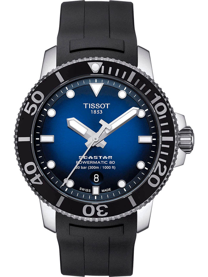 Мужские механические наручные часы TISSOT Seastar 1000 Powermatic 80 T120.407.17.041.00 коллекции T Sport с автоподзаводом и возможностью ручного завода. Калибр механизма — Powermatic 80.111. В механизме часов использована запатентованная балансирная пружина Nivachron, благодаря чему запас хода значительно увеличен и составляет не менее 80-ти часов. Количество камней - 23. Функция стоп-секунда (остановка секундной стрелки для установки точного времени). На данной модели отображается текущая дата. Стрелки и метки покрыты люминесцентным напылением Super-LumiNova® (светятся в темноте). Сапфировое стекло с антибликовым покрытием, устойчивое к появлению царапин. Прозрачная задняя крышка. Завинчивающиеся заводная головка и задняя крышка. Однонаправленный вращающийся безель с керамической вставкой. Полимерный ремешок. Водонепроницаемость WR300 (30 атм). Размеры корпуса: (ШxТ) 43x12.7 мм. Гарантийный срок — 3 года (1 год от производителя + 2 года от магазина).