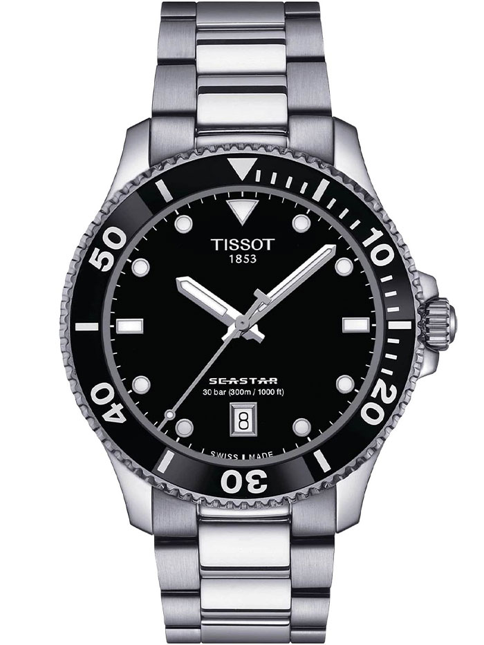 Мужские кварцевые наручные часы TISSOT Seastar 1000 T120.410.11.051.00 коллекции T Sport. Калибр механизма — ETA F06.412. На данной модели отображается текущая дата. Стрелки и метки покрыты люминесцентным напылением Super-LumiNova® (светятся в темноте). Сапфировое стекло с антибликовым покрытием, устойчивое к появлению царапин. Завинчивающиеся заводная головка и задняя крышка. Однонаправленный вращающийся безель с вставкой из минерального стекла. Стальной браслет с системой быстрой замены.Водонепроницаемость WR300 (30 атм). Размеры корпуса: (ШxТ) 40x10 мм. Гарантийный срок — 3 года (1 год от производителя + 2 года от магазина).
