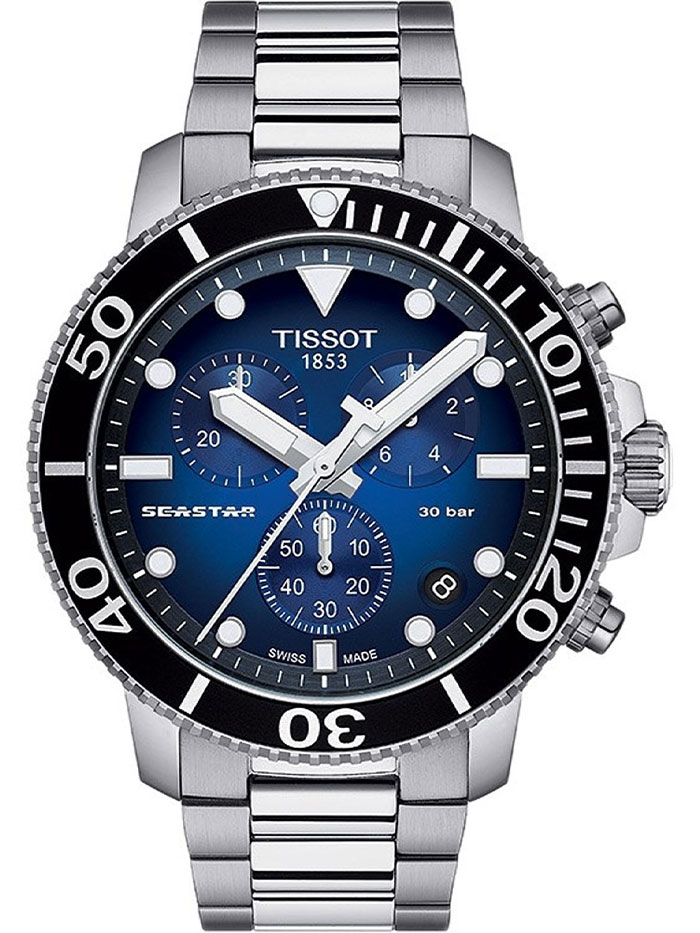 Мужские кварцевые наручные часы с хронографом (секундомером) TISSOT Seastar 1000 Chronograph T120.417.11.041.01 коллекции T Sport. Калибр механизма — ETA G10.212. На данной модели отображается текущая дата. Секундомер может отсчитывать до 29 минут 59 секунд. Стрелки и метки покрыты люминесцентным напылением Super-LumiNova® (светятся в темноте). Сапфировое стекло с антибликовым покрытием, устойчивое к появлению царапин. Завинчивающиеся заводная головка и задняя крышка. Однонаправленный вращающийся безель. Стальной браслет с системой быстрой замены и возможностью быстрого удлинения для удобного использования с гидрокостюмом. На корпус частично нанесено стойкое PVD покрытие. Водонепроницаемость WR300 (30 атм). Размеры корпуса: (ШxТ) 45.5x12.8 мм. Гарантийный срок — 3 года (1 год от производителя + 2 года от магазина).