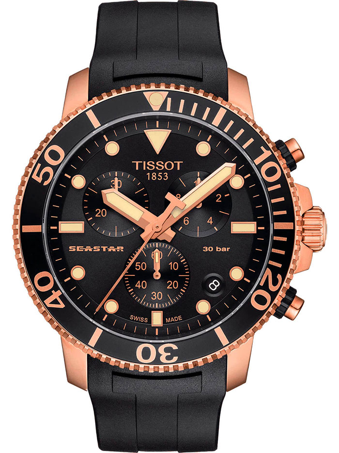 Мужские кварцевые наручные часы с хронографом (секундомером) TISSOT Seastar 1000 Chronograph T120.417.37.051.00 коллекции T Sport. Калибр механизма — ETA G10.212. На данной модели отображается текущая дата. Секундомер может отсчитывать до 29 минут 59 секунд. Стрелки и метки покрыты люминесцентным напылением Super-LumiNova® (светятся в темноте). Сапфировое стекло с антибликовым покрытием, устойчивое к появлению царапин. Завинчивающиеся заводная головка и задняя крышка. Однонаправленный вращающийся безель. Полимерный ремешок. На корпус нанесено стойкое PVD покрытие. Водонепроницаемость WR300 (30 атм). Размеры корпуса: (ШxТ) 45.5x12.8 мм. Гарантийный срок — 3 года (1 год от производителя + 2 года от магазина).