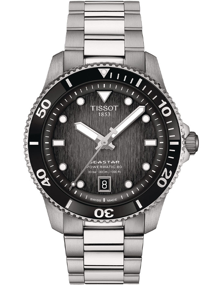 Мужские механические наручные часы TISSOT Seastar 1000 Powermatic 80 T120.807.11.051.00 коллекции T Sport с автоподзаводом и возможностью ручного завода. Калибр механизма — Powermatic 80.111. В механизме часов использована запатентованная балансирная пружина Nivachron, благодаря чему запас хода значительно увеличен и составляет не менее 80-ти часов. Количество камней - 23. Функция стоп-секунда (остановка секундной стрелки для установки точного времени). На данной модели отображается текущая дата. Стрелки и метки покрыты люминесцентным напылением Super-LumiNova® (светятся в темноте). Сапфировое стекло с антибликовым покрытием, устойчивое к появлению царапин. Прозрачная задняя крышка. Завинчивающиеся заводная головка и задняя крышка. Однонаправленный вращающийся безель с вставкой из минерального стекла. Стальной браслет с системой быстрой замены. Водонепроницаемость WR300 (30 атм). Размеры корпуса: (ШxТ) 40x12.5 мм. Гарантийный срок — 3 года (1 год от производителя + 2 года от магазина).