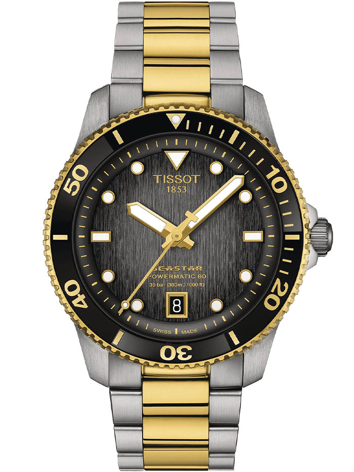 Мужские механические наручные часы TISSOT Seastar 1000 Powermatic 80 T120.807.22.051.00 коллекции T Sport с автоподзаводом и возможностью ручного завода. Калибр механизма — Powermatic 80.111. В механизме часов использована запатентованная балансирная пружина Nivachron, благодаря чему запас хода значительно увеличен и составляет не менее 80-ти часов. Количество камней - 23. Функция стоп-секунда (остановка секундной стрелки для установки точного времени). На данной модели отображается текущая дата. Стрелки и метки покрыты люминесцентным напылением Super-LumiNova® (светятся в темноте). Сапфировое стекло с антибликовым покрытием, устойчивое к появлению царапин. Прозрачная задняя крышка. Завинчивающиеся заводная головка и задняя крышка. Однонаправленный вращающийся безель с вставкой из минерального стекла. Стальной браслет с системой быстрой замены. На корпус и браслет частично нанесено стойкое PVD покрытие. Водонепроницаемость WR300 (30 атм). Размеры корпуса: (ШxТ) 40x12.5 мм. Гарантийный срок — 3 года (1 год от производителя + 2 года от магазина).
