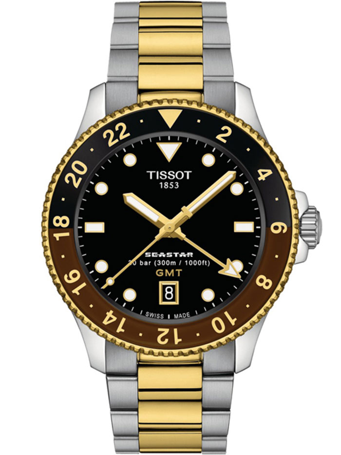 Мужские кварцевые наручные часы TISSOT Seastar 1000 Quartz GMT T120.852.22.051.00 коллекции T Sport. Калибр механизма — ETA. На данной модели отображается текущая дата и время во втором часовом поясе (двойное время). Стрелки и метки покрыты люминесцентным напылением Super-LumiNova® (светятся в темноте). Сапфировое стекло с антибликовым покрытием, устойчивое к появлению царапин. Завинчивающиеся заводная головка и задняя крышка. Однонаправленный вращающийся безель с вставкой из минерального стекла. Стальной браслет с системой быстрой замены. На корпус и браслет частично нанесено стойкое PVD покрытие. Водонепроницаемость WR300 (30 атм). Размеры корпуса: (ШxТ) 40x11.8 мм. Гарантийный срок — 3 года (1 год от производителя + 2 года от магазина).