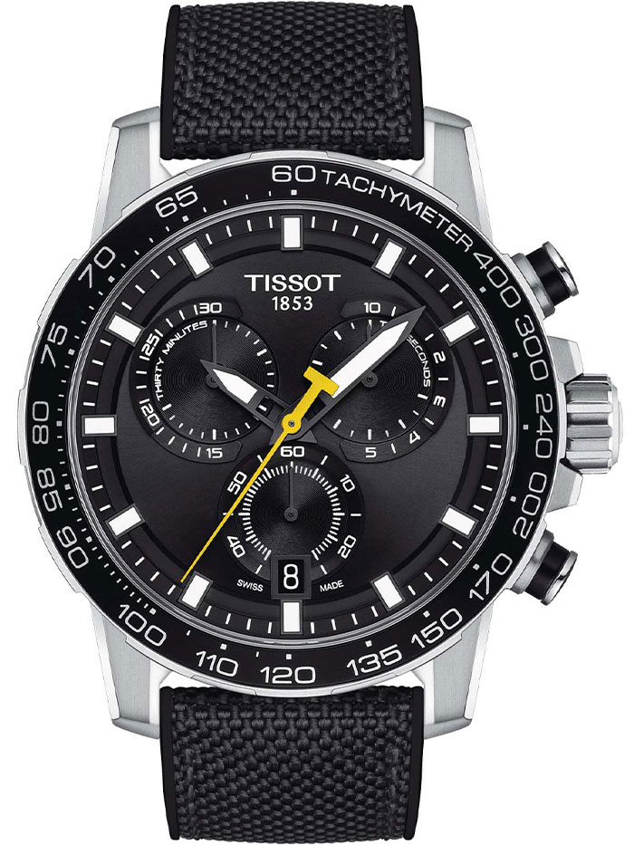 Мужские кварцевые наручные часы с хронографом (секундомером) TISSOT SuperSport Chrono T125.617.17.051.02 коллекции T Sport. Калибр механизма — ETA G10.212. На данной модели отображается текущая дата. Секундомер может отсчитывать до 29 минут 59 секунд. На безеле присутсвует шкала тахиметра для измерения средней скорости движения. Стрелки и метки покрыты люминесцентным напылением Super-LumiNova® (светятся в темноте). Сапфировое стекло с антибликовым покрытием, устойчивое к появлению царапин. Текстильный ремешок. На корпус частично нанесено стойкое PVD покрытие. Водонепроницаемость WR100 (10 атм). Размеры корпуса: (ШxТ) 45.5х12 мм. Гарантийный срок — 3 года (1 год от производителя + 2 года от магазина).