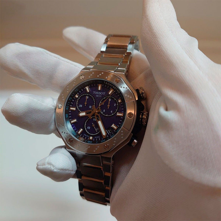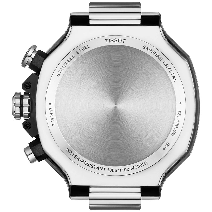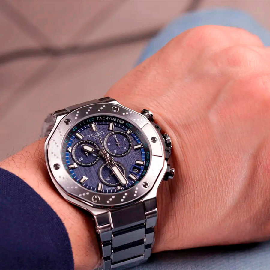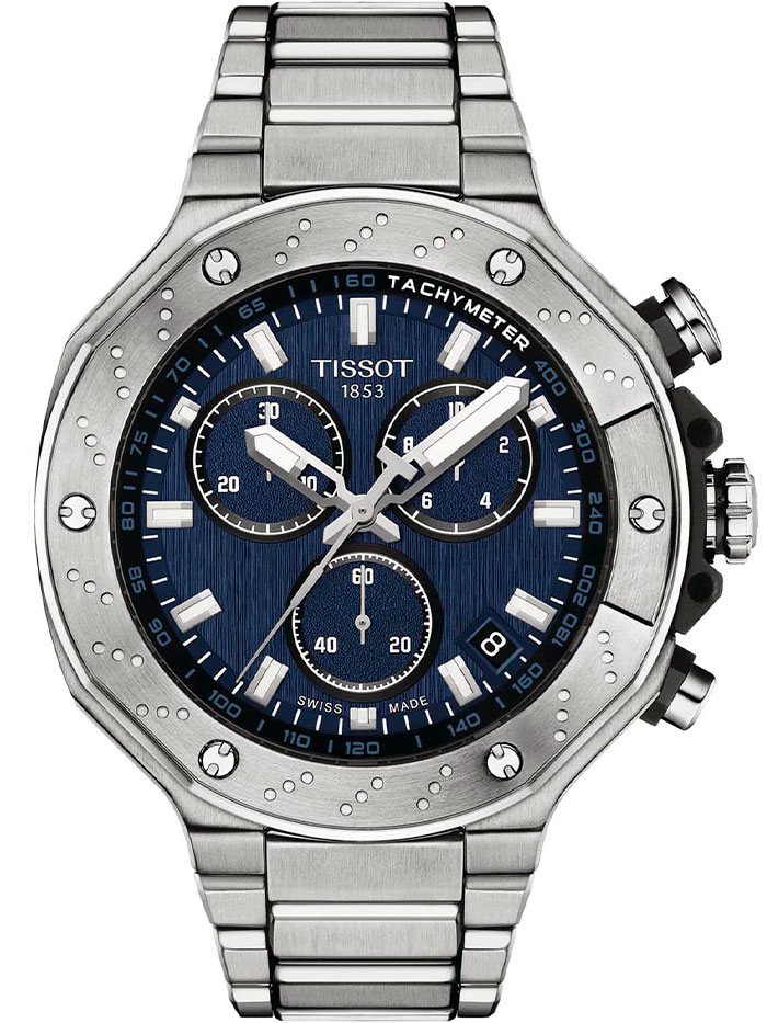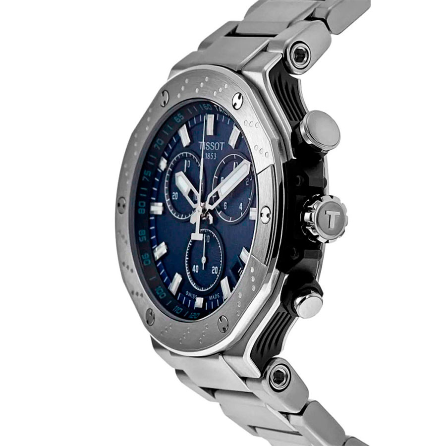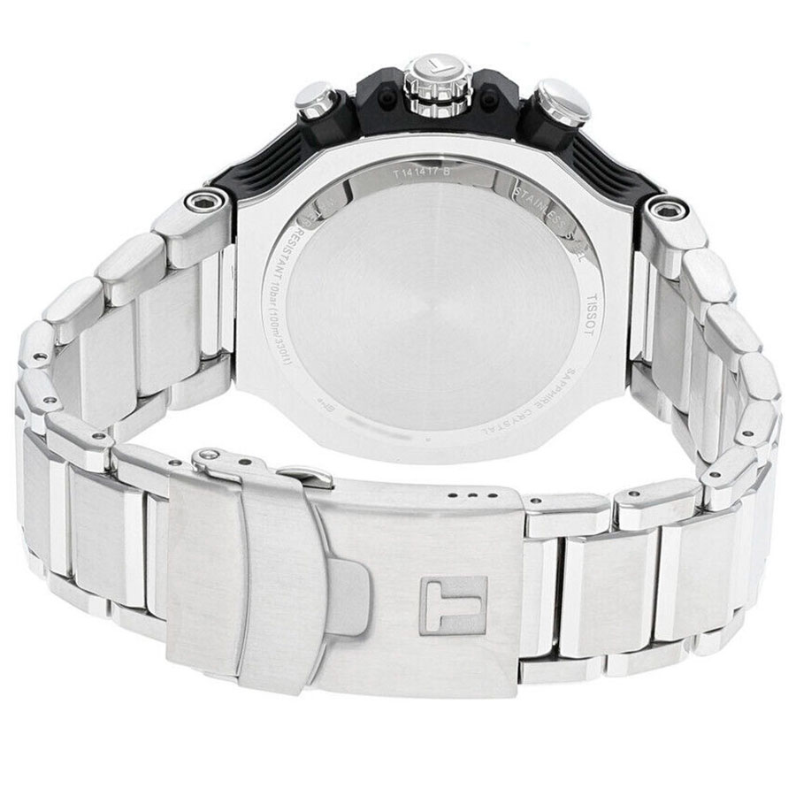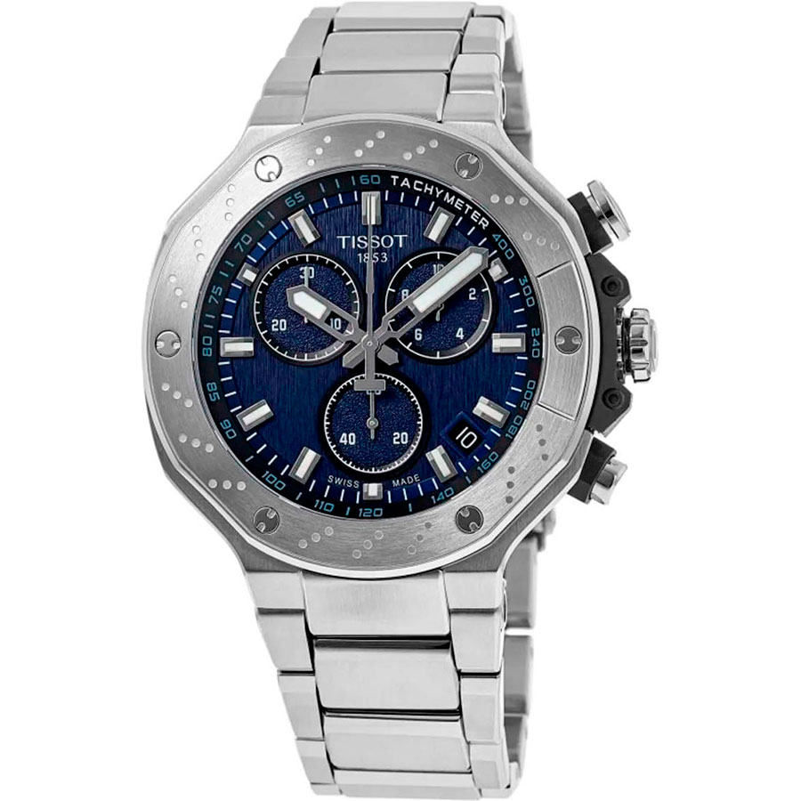 Мужские кварцевые наручные часы с хронографом (секундомером) TISSOT  T-Race MotoGP Chronograph T141.417.11.041.00 коллекции T Sport. Калибр механизма — ETA G10.212. На данной модели отображается текущая дата. Секундомер может отсчитывать до 29 минут 59 секунд. На циферблате присутсвует шкала тахиметра для измерения средней скорости движения. Стрелки и метки покрыты люминесцентным напылением Super-LumiNova® (светятся в темноте). Сапфировое стекло с антибликовым покрытием, устойчивое к появлению царапин. Стальной браслет. Водонепроницаемость WR100 (10 атм). Размеры корпуса: (ШxТ) 45х11.7 мм. Гарантийный срок — 3 года (1 год от производителя + 2 года от магазина).