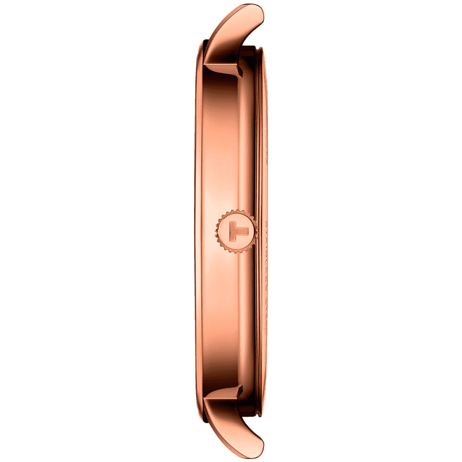 Корпус выполнен из нержавеющей стали и покрыт стойким PVD в тоне розового золота, придающим часам статусный и элегантный вид. Классический кожаный ремень обеспечивает комфортное ношение, а серебристый циферблат с тонкими метками подчеркивает сдержанный характер модели. От царапин механизм защищает сапфировое стекло.