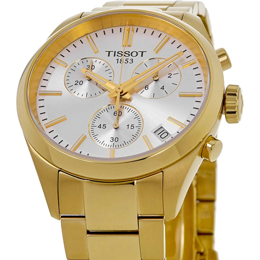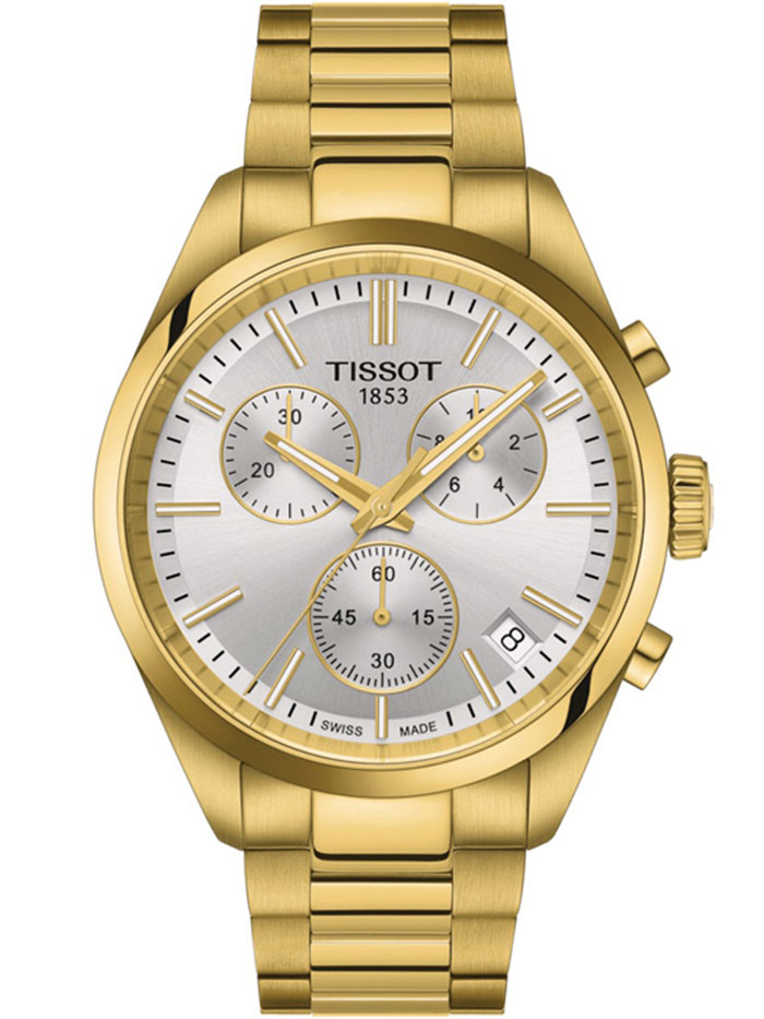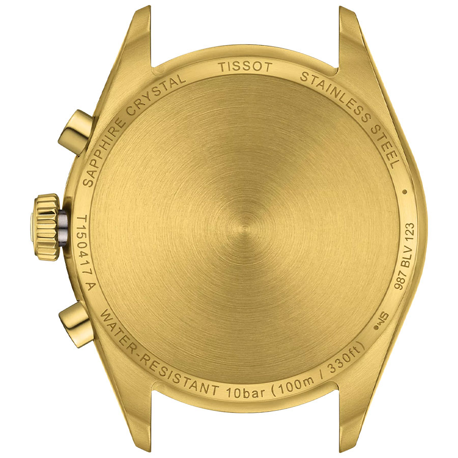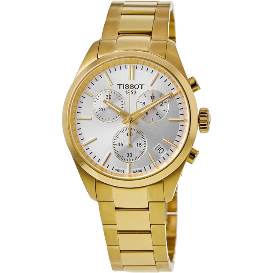 Мужские кварцевые наручные часы с хронографом (секундомером) TISSOT PR 100 Chronograph T150.417.33.031.00 коллекции T Classic. Калибр механизма — ETA G10.212. На данной модели отображается текущая дата. Секундомер может отсчитывать до 29 минут 59 секунд. Стрелки и метки покрыты люминесцентным напылением Super-LumiNova® (светятся в темноте). Сапфировое стекло с антибликовым покрытием, устойчивое к появлению царапин. Стальной браслет. На корпус и браслет нанесено стойкое PVD покрытие. Водонепроницаемость WR100 (10 атм). Размеры корпуса: (ШxТ) 40х11.3 мм. Гарантийный срок — 3 года (1 год от производителя + 2 года от магазина).