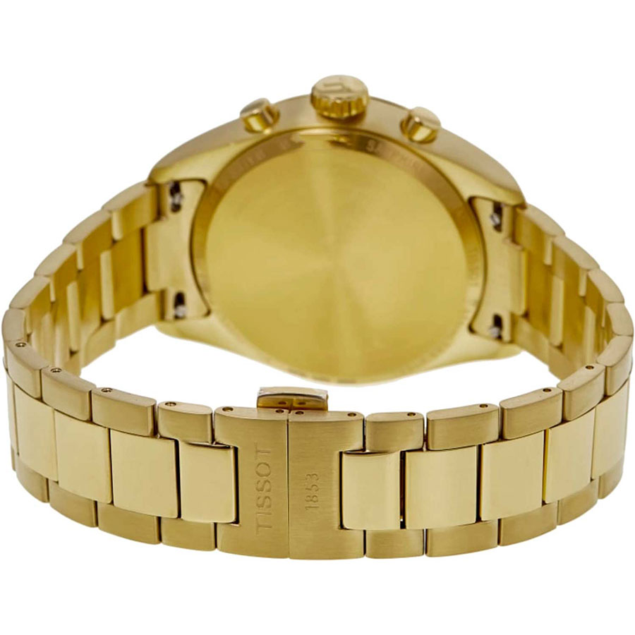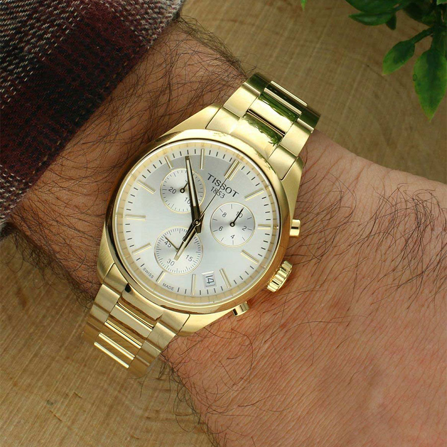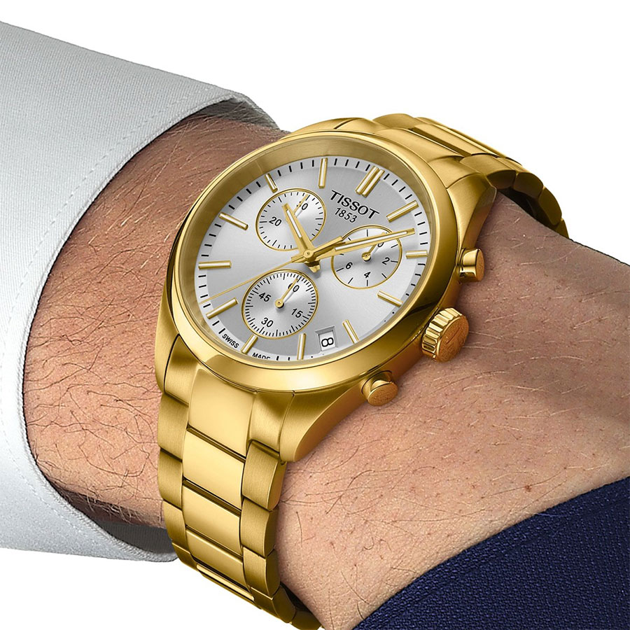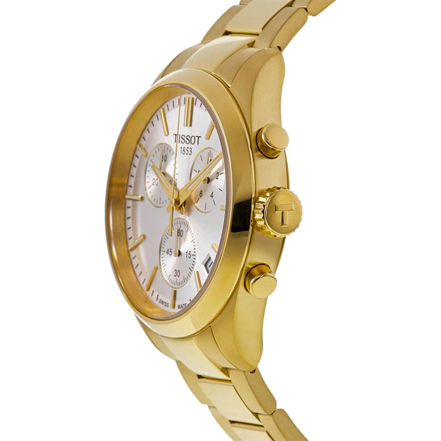 Мужские кварцевые наручные часы с хронографом (секундомером) TISSOT PR 100 Chronograph T150.417.33.031.00 коллекции T Classic. Калибр механизма — ETA G10.212. На данной модели отображается текущая дата. Секундомер может отсчитывать до 29 минут 59 секунд. Стрелки и метки покрыты люминесцентным напылением Super-LumiNova® (светятся в темноте). Сапфировое стекло с антибликовым покрытием, устойчивое к появлению царапин. Стальной браслет. На корпус и браслет нанесено стойкое PVD покрытие. Водонепроницаемость WR100 (10 атм). Размеры корпуса: (ШxТ) 40х11.3 мм. Гарантийный срок — 3 года (1 год от производителя + 2 года от магазина).