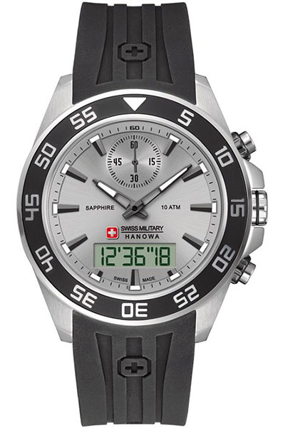 Мужские кварцевые наручные часы с хронографом (секундомером) Swiss Military Hanowa 06-4222.04.009 Sword Anadigit Chrono коллекции Navy Line. Калибр механизма — ISA 9516/3030. Секундомер может отсчитывать до 99 часов 59 минут 59 сек. с шагом 1/100 секунды. На данной модели отображается дата и день недели. Функция двойного времени. Диодная подсветка цифровой индикации. Стрелки и метки покрыты люминесцентным напылением (светятся в темноте). Сапфировое стекло. Завинчивающаяся задняя крышка часов. Водонепроницаемость WR100 (10 атм).