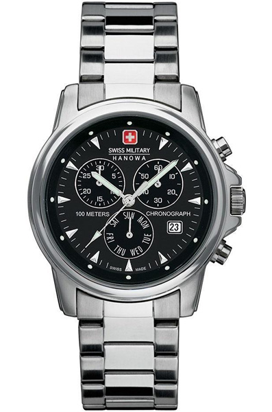 Мужские кварцевые наручные часы с хронографом (секундомером) Swiss Military Hanowa 06-5010.04.007 Swiss Recruit Chrono коллекции Challenge Line. Калибр механизма — ISA 8172. Секундомер может отсчитывать до 30 минут с шагом 1/5 секунды. На данной модели отображается дата и день недели. Стрелки и метки покрыты люминесцентным напылением (светятся в темноте). Завинчивающаяся задняя крышка часов. Водонепроницаемость WR100 (10 атм).