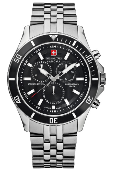 Мужские кварцевые наручные часы с хронографом (секундомером) Swiss Military Hanowa 06-5183.7.04.007 Flaghip Chrono коллекции Navy Line. Калибр механизма — ISA 8171/202. Секундомер может отсчитывать до 30 минут с шагом 1/5 секунды. На данной модели отображается дата. Стрелки и метки покрыты люминесцентным напылением (светятся в темноте). Сапфировое стекло. Завинчивающаяся задняя крышка часов. Водонепроницаемость WR100 (10 атм).