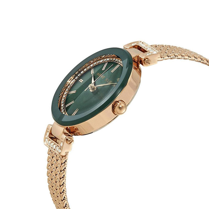 Женские кварцевые наручные часы Anne Klein 1906GNRG коллекции Crystal Metals. Браслет и циферблат украшены кристаллами Swarovski. На корпус и браслет нанесено стойкое PVD покрытие. Водонепроницаемость WR (3 атм).