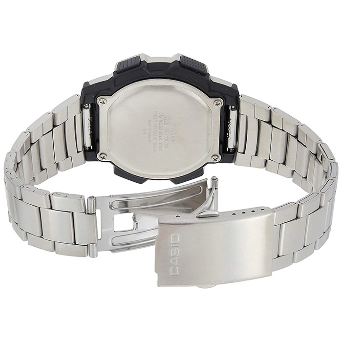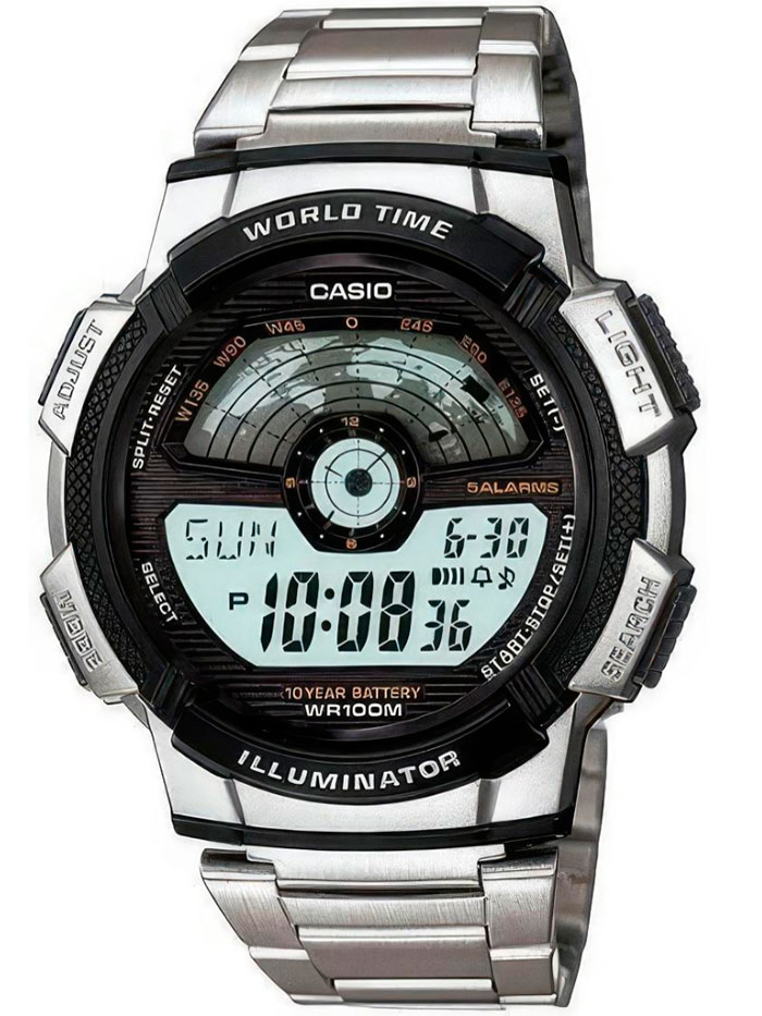 Электронные кварцевые мужские наручные часы Casio AE-1100WD-1A с цифровой индикацией времени. Калибр механизма — 3264. Функциональность данной модели: формат времени 12/24, мировое время 48 городов (31 часовой пояс) с индикацией часовых поясов на карте циферблата, двойное время, автоматический календарь до 2099 года, 5 независимых будильников, сигнал начала часа, секундомер с точностью 1/100 секунды и измерением до 23 часов 59 минут 59,99 cек., таймер обратного отсчета (диапазон времени 24 часа), диодная подсветка циферблата с возможностью выбора времени свечения (1.5 или 3 секунды), функция выключения звука кнопок (Mute). Стальной браслет. Батарейка на 10 лет работы. Водонепроницаемость WR100 (10 атм). Размеры корпуса: (ШxВxТ) 43.7x48.1x13.7 мм. Гарантийный срок — 3 года (1 год от производителя + 2 года от магазина).